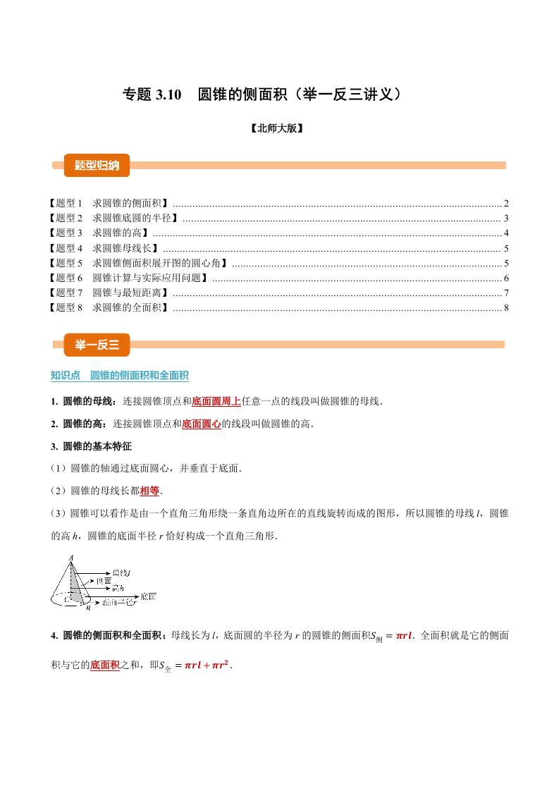 专题3.10 圆锥的侧面积(举一反三讲义)(原卷版)