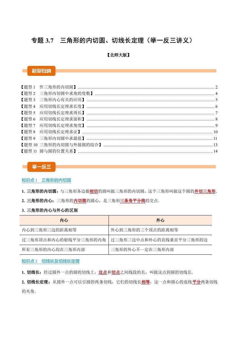 专题3.7 三角形的内切圆、切线长定理(举一反三讲义)(解析版)