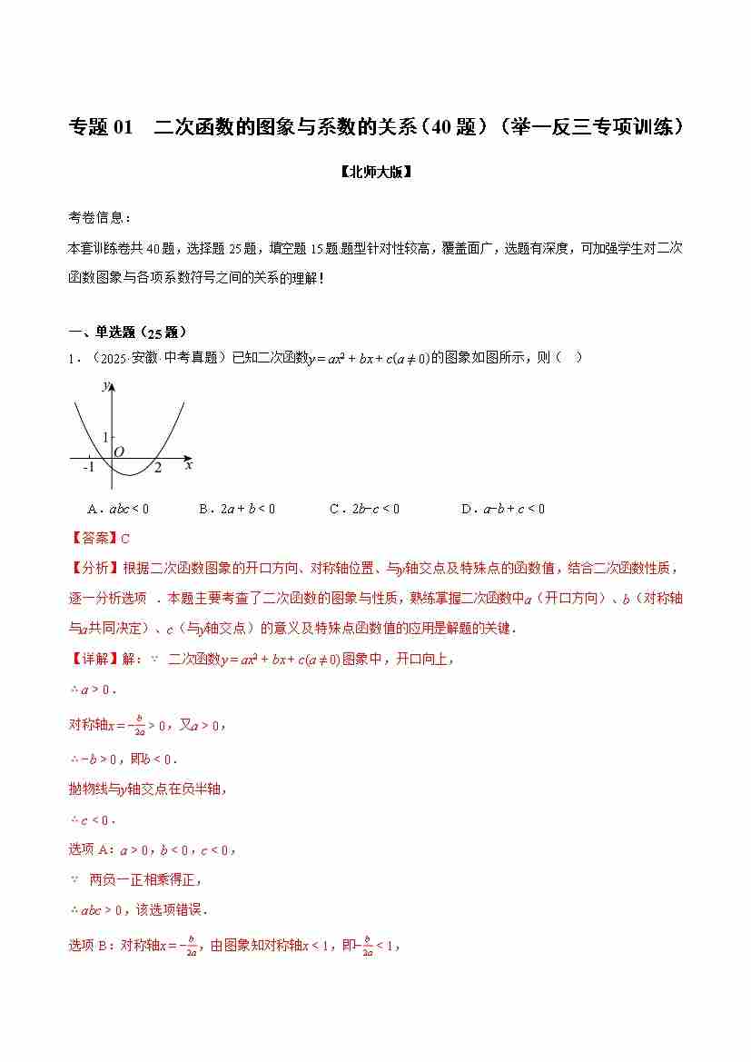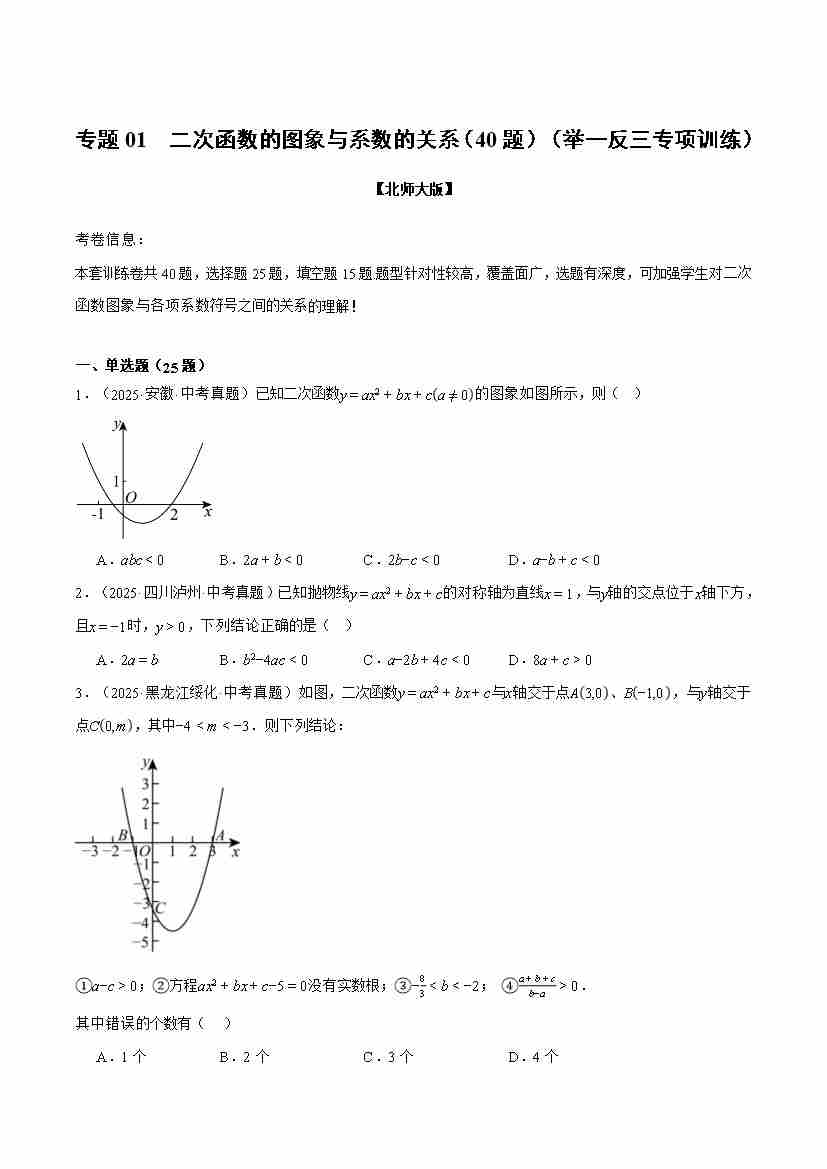专题01 二次函数的图象与系数的关系(40题)(举一反三专项训练)(原卷版)