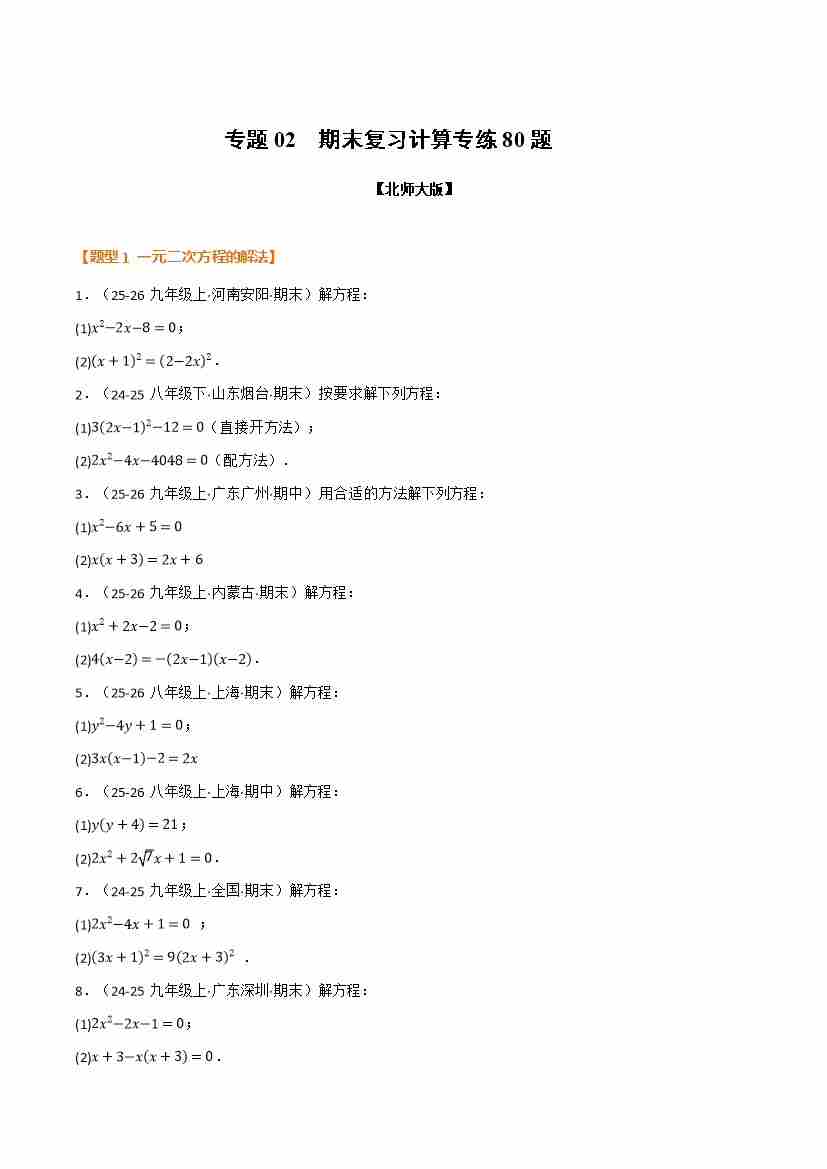 专题02 期末复习计算专练80题(举一反三期末专项训练)(原卷版)