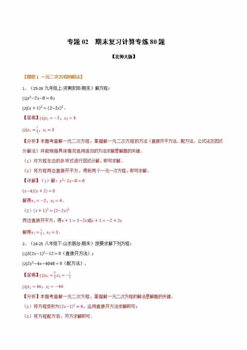 专题02 期末复习计算专练80题(举一反三期末专项训练)(解析版)