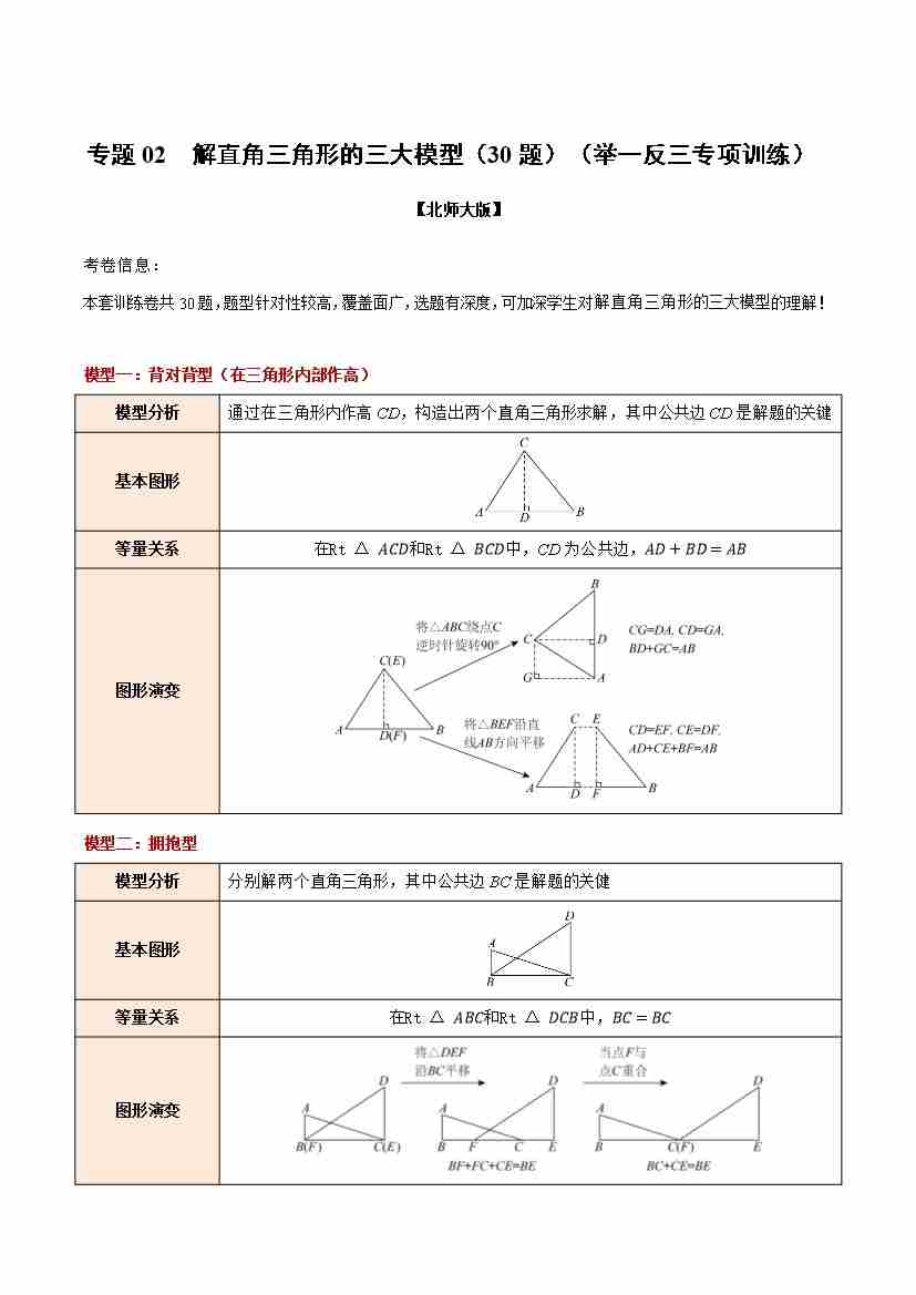 专题02 解直角三角形的三大模型(30题)(举一反三专项训练)(原卷版)