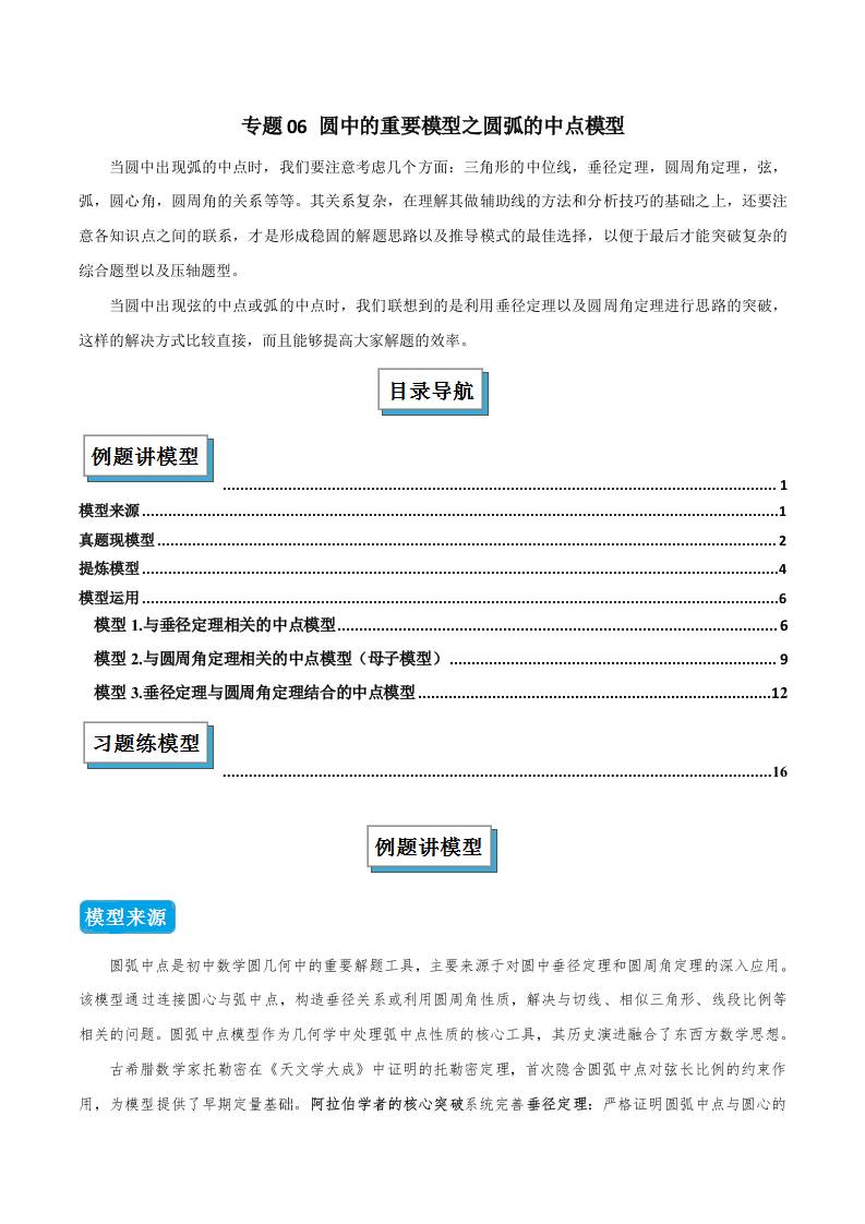 专题06 圆中的重要模型之圆弧的中点模型(几何模型讲义)(原卷版)