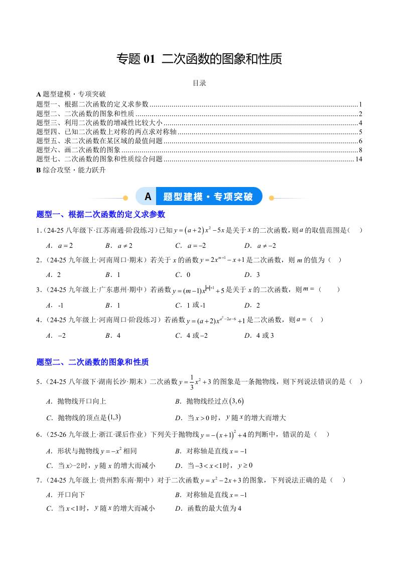 专题01 二次函数的图象和性质(7大题型)(专项训练)(原卷版)
