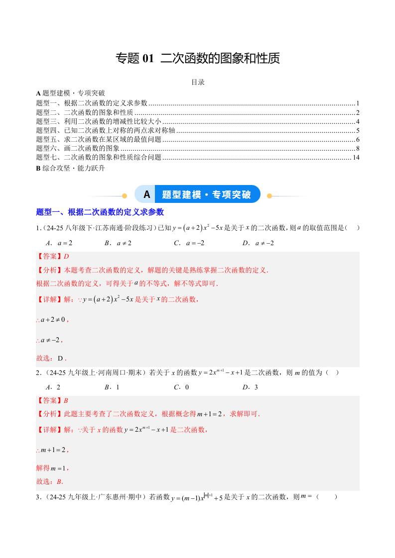 专题01 二次函数的图象和性质(7大题型)(专项训练)(解析版)