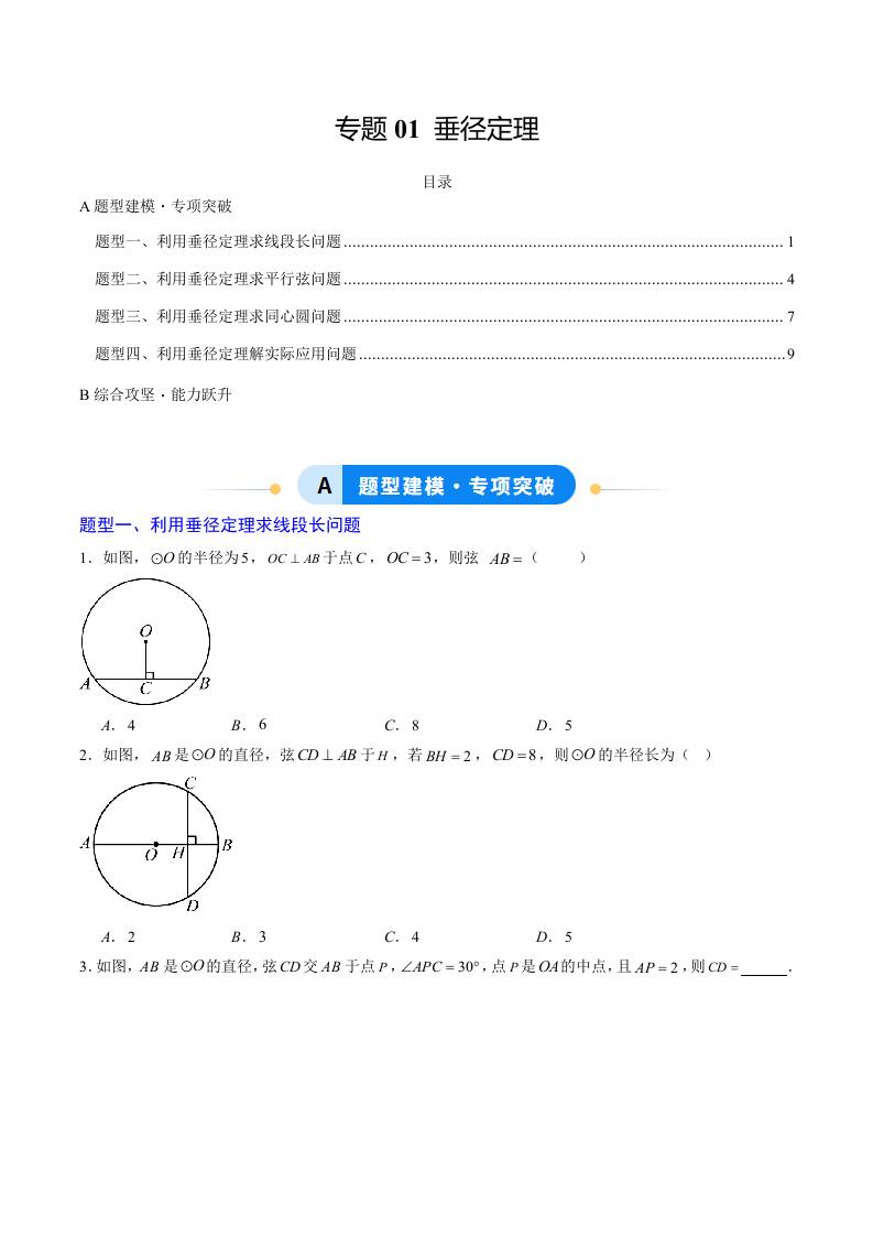 专题01 垂径定理(4大题型)(专项训练)(原卷版)