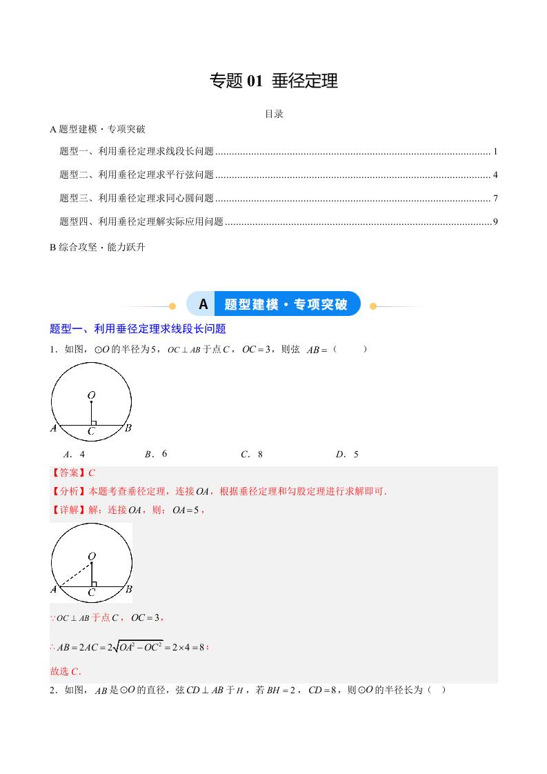 专题01 垂径定理(4大题型)(专项训练)(解析版)