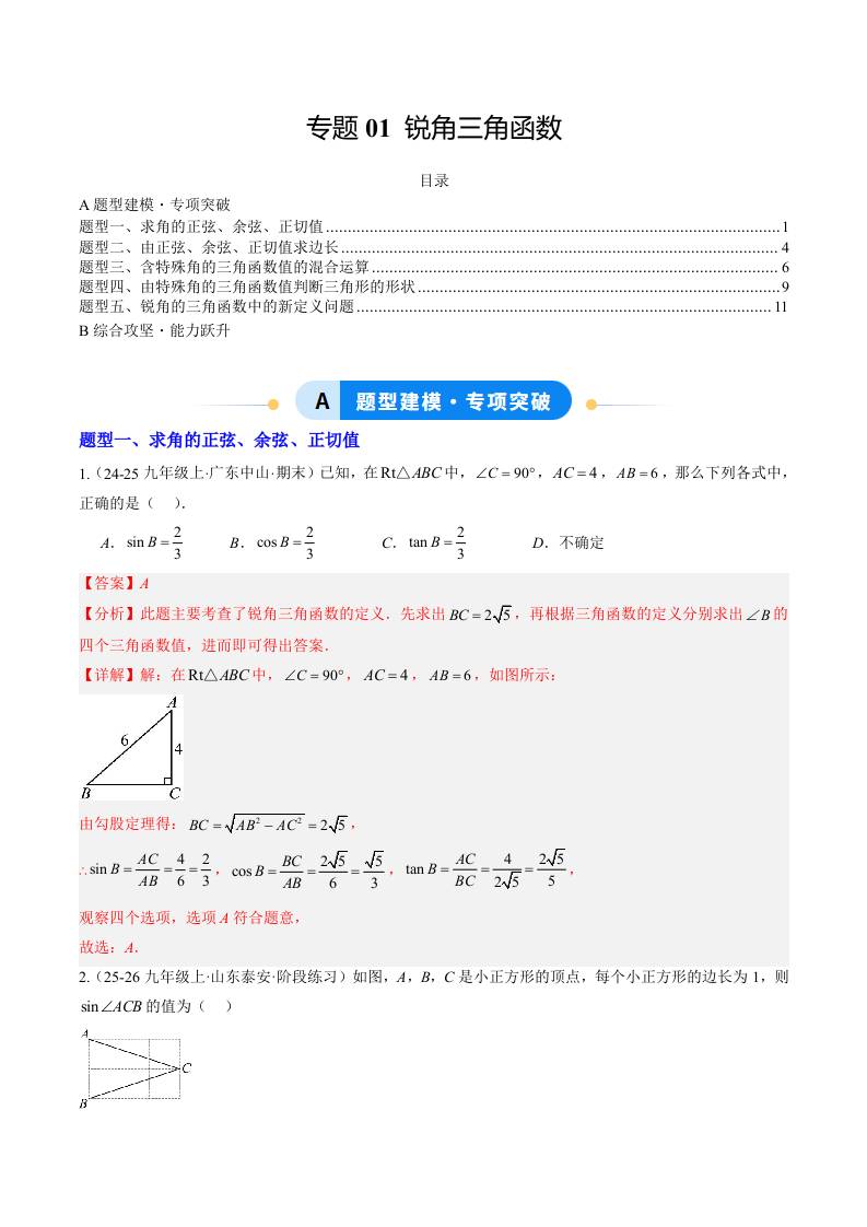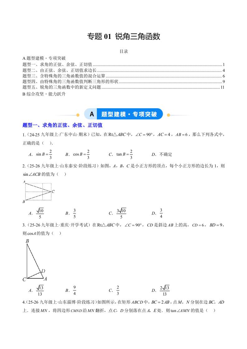 专题01 锐角三角函数(5大题型)(专项训练)(原卷版)