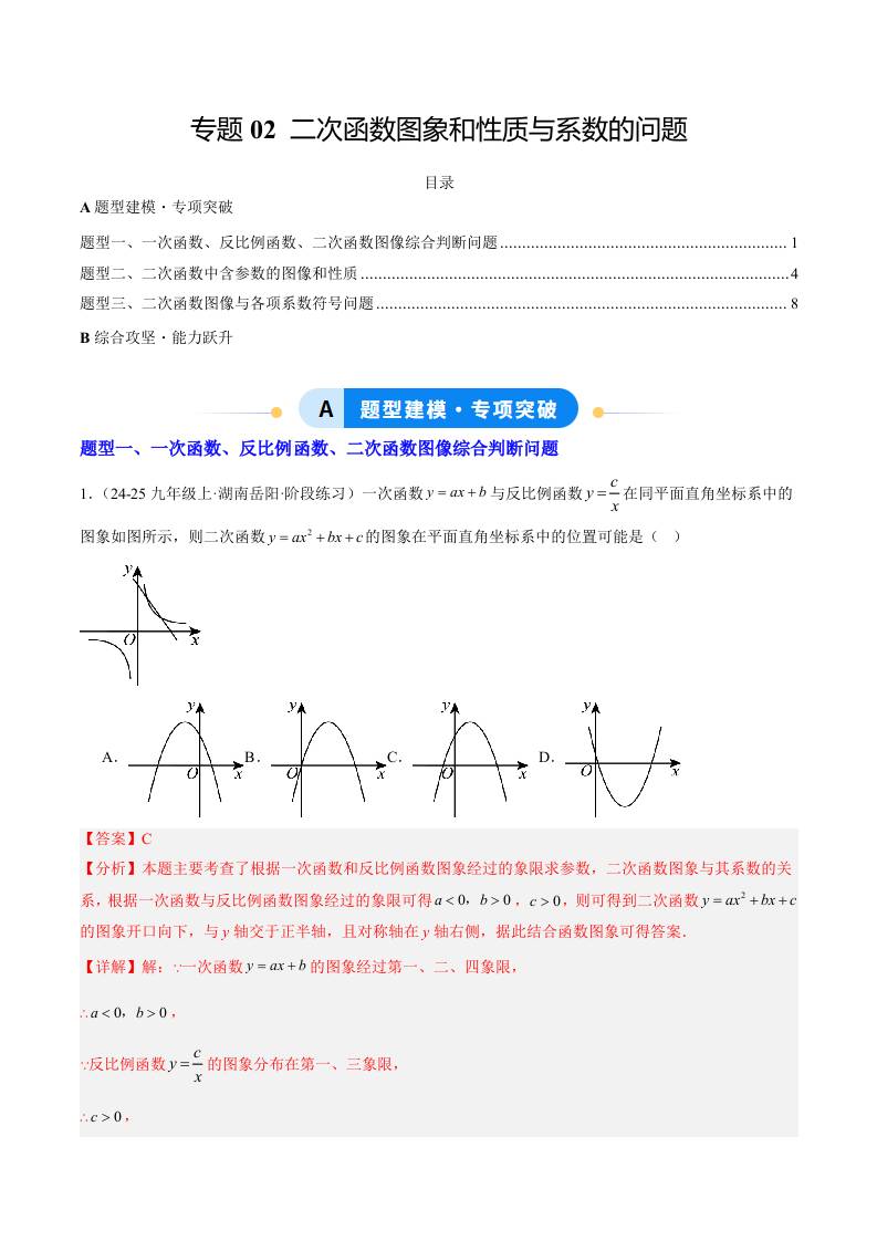 专题02 二次函数图象和性质与系数的问题(3大题型)(专项训练)(解析版)