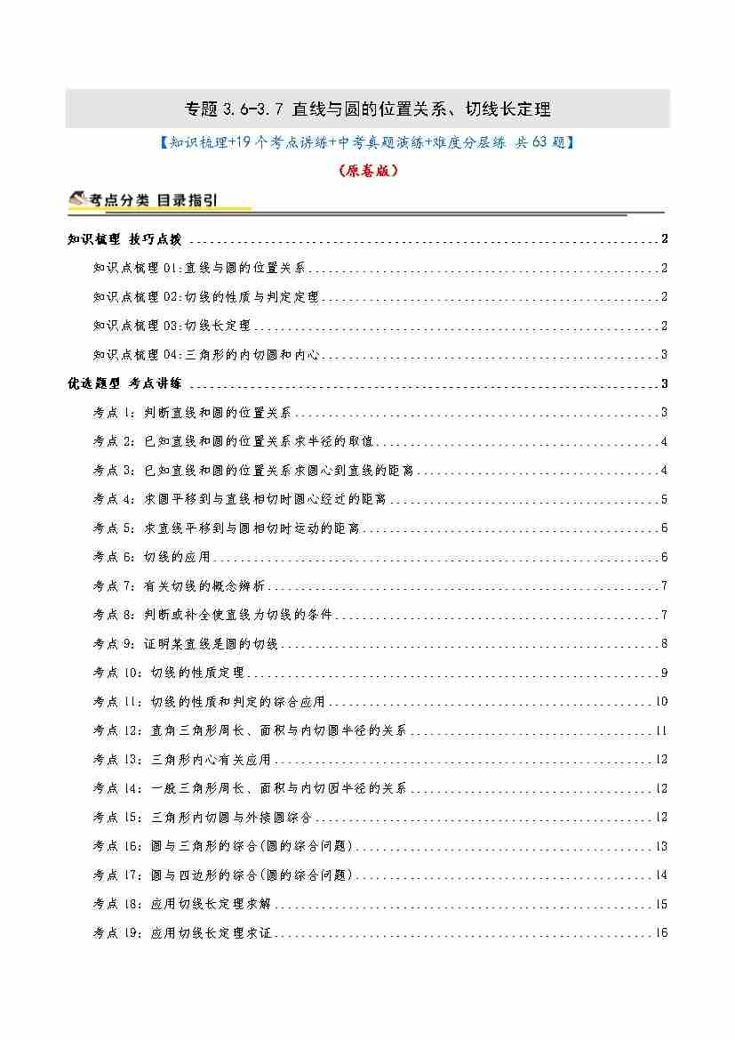 专题3.6-3.7 直线与圆的位置关系、切线长定理(知识梳理19个考点讲练中考真题演练难度分层练 共63题)原卷版