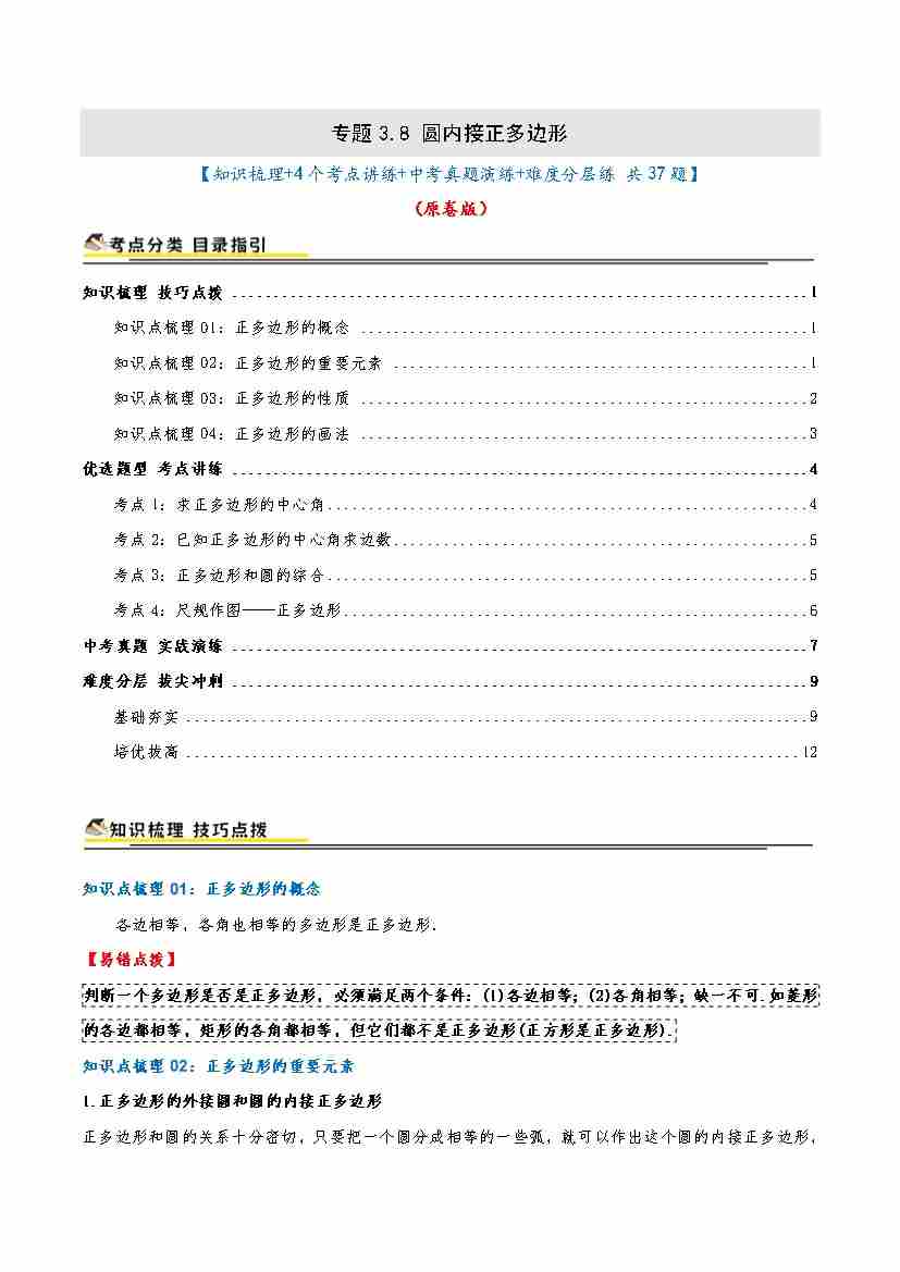 专题3.8 圆内接正多边形(知识梳理4个考点讲练中考真题演练难度分层练 共37题)原卷版