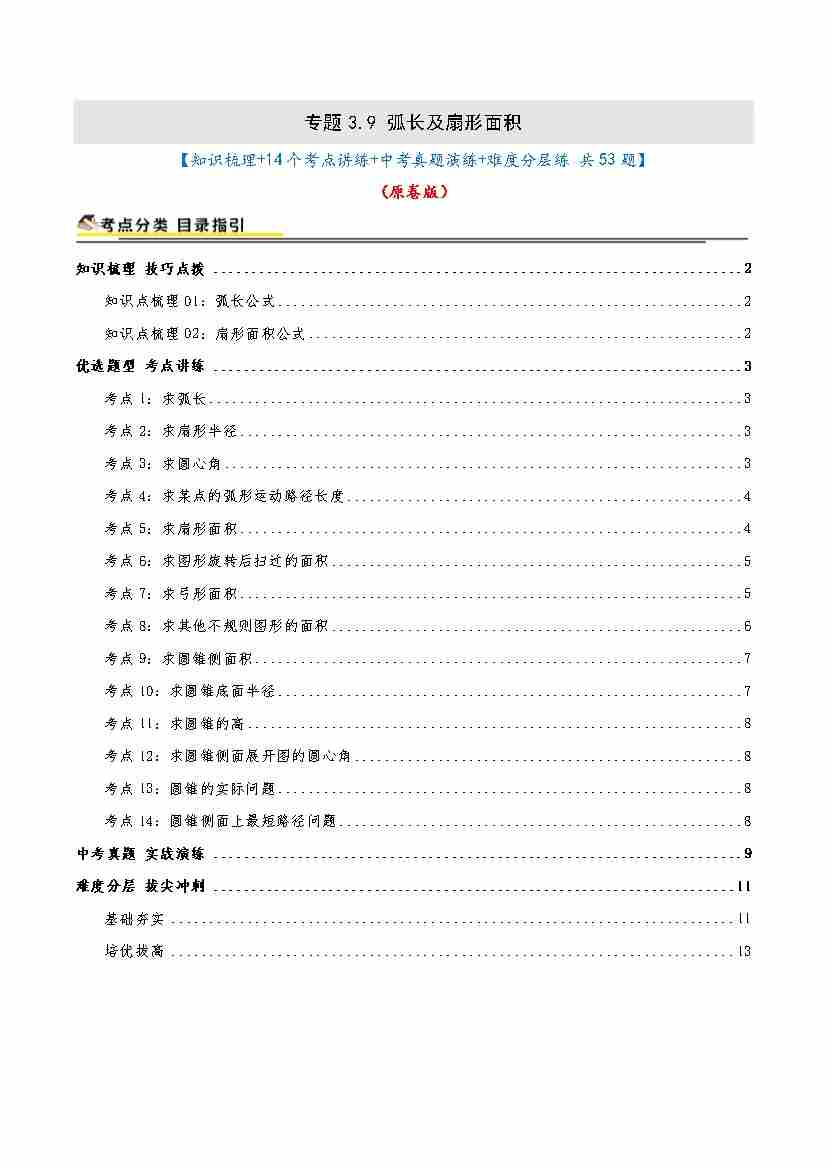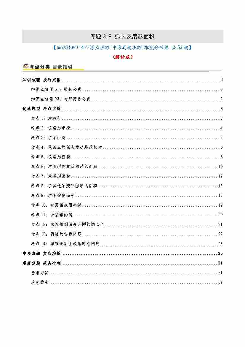 专题3.9 弧长及扇形面积(知识梳理14个考点讲练中考真题演练难度分层练 共53题)原卷版