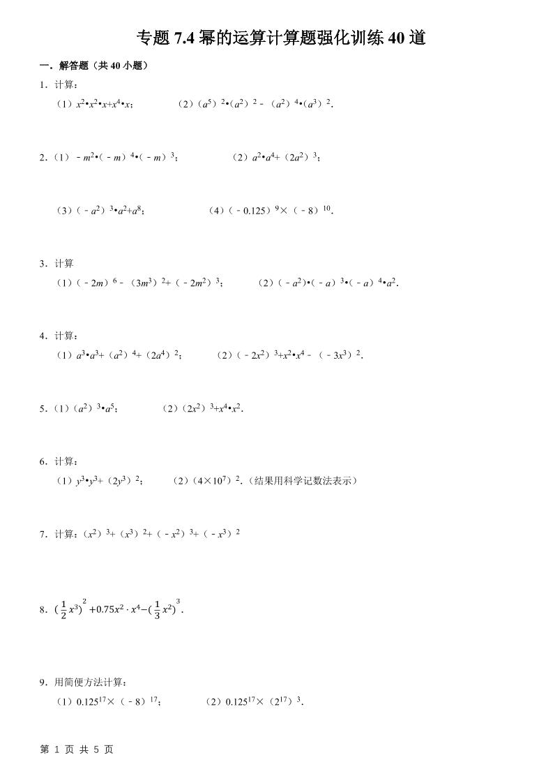 专题7.4幂的运算计算题强化训练40道(原卷版)