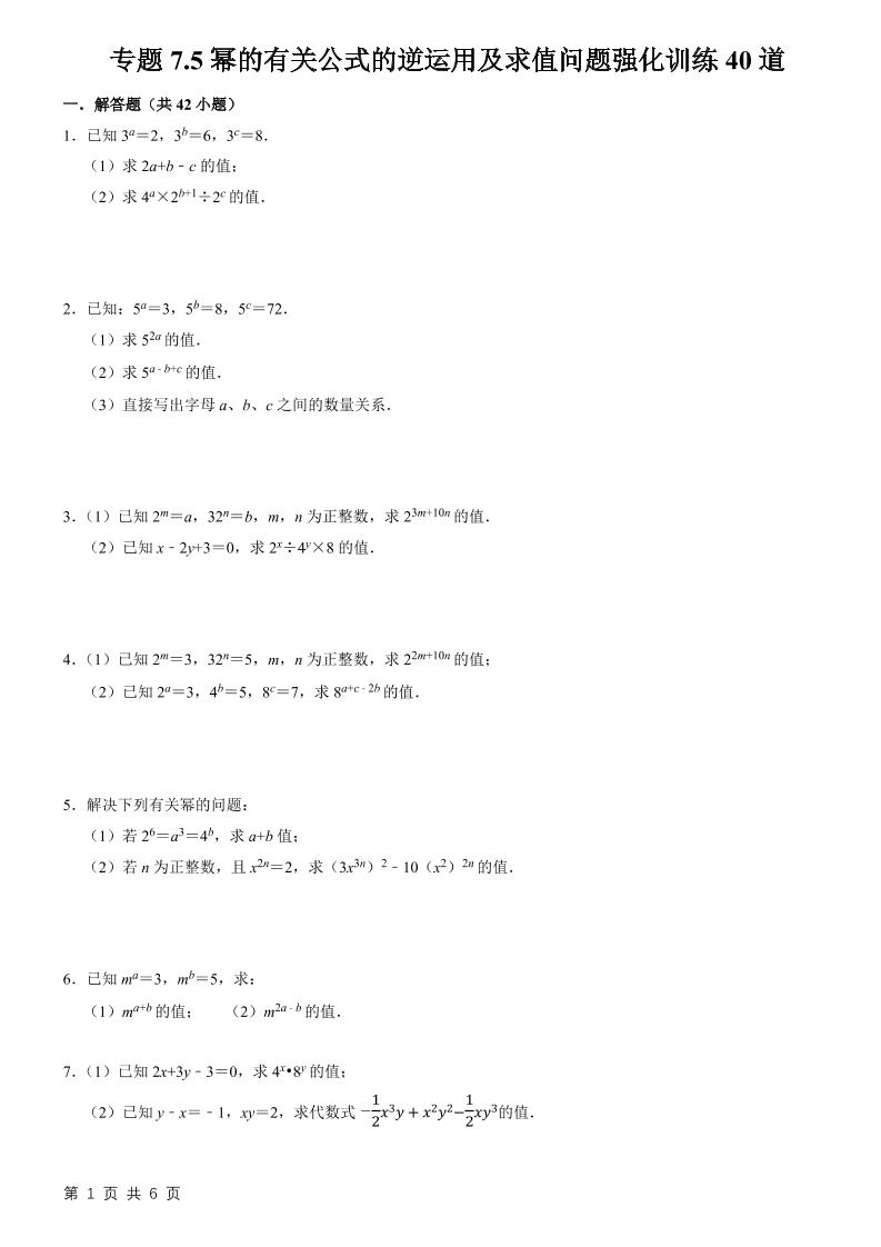 专题7.5幂的有关公式的逆运用及求值问题强化训练40道(原卷版)