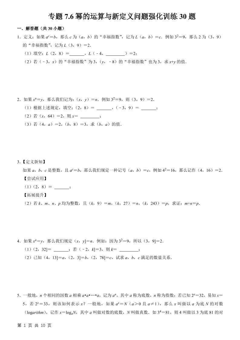 专题7.6幂的运算与新定义问题强化训练30题(原卷版)