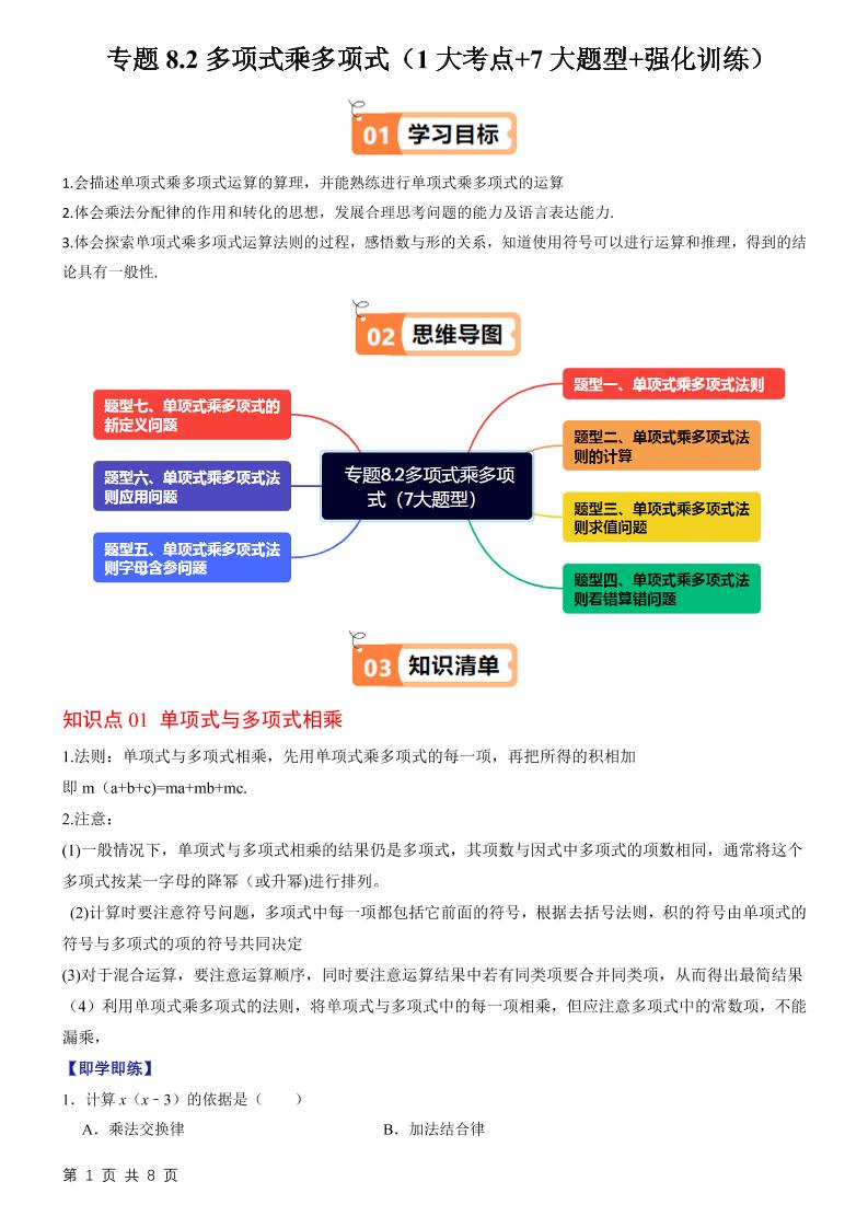 专题8.2多项式乘多项式(1大考点、8大题型、强化训练)(原卷版)
