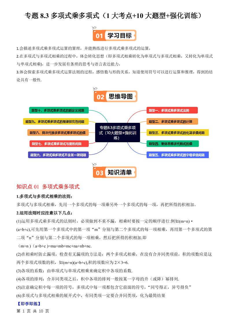 专题8.3多项式乘多项式(1大考点、10大题型、强化训练)(原卷版)