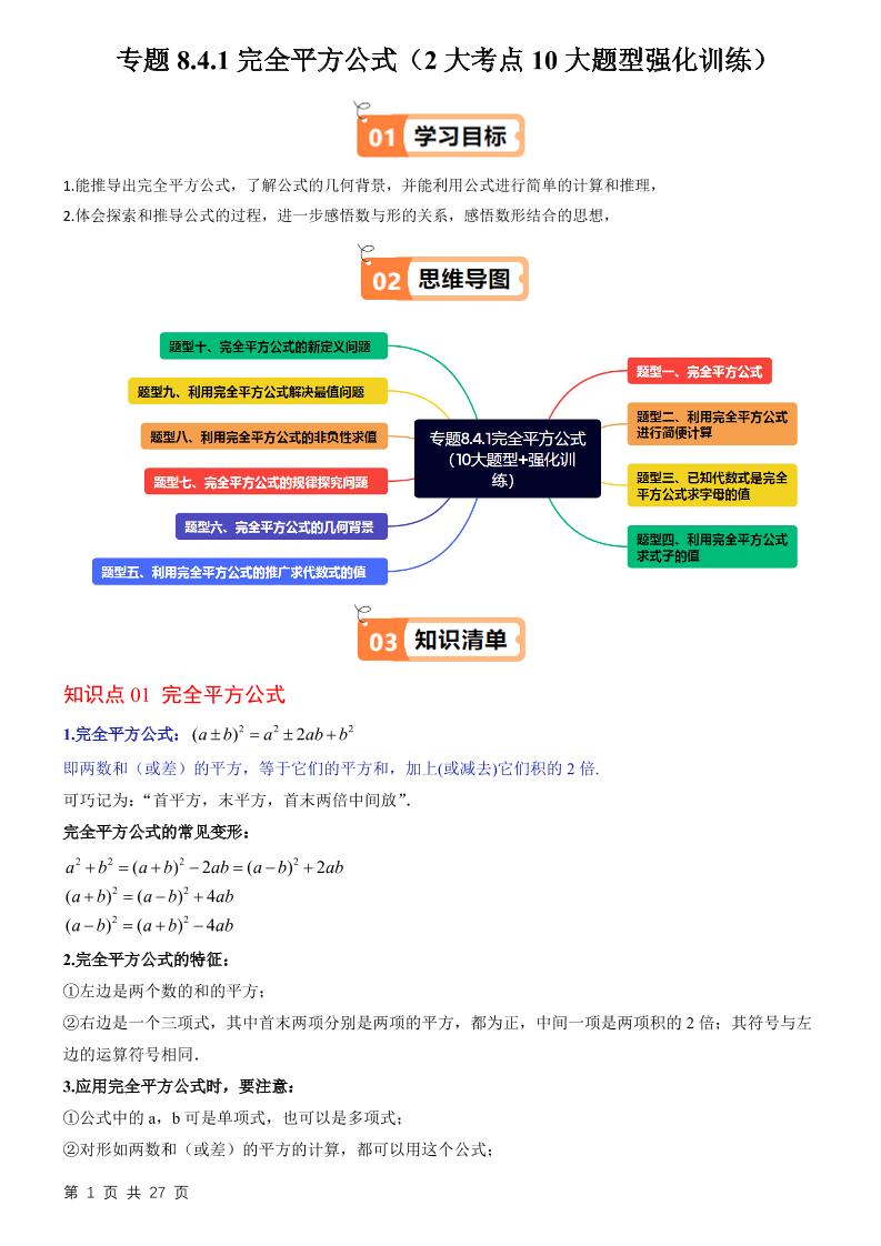 专题8.4.1完全平方公式(2大考点10大题型强化训练)(解析版)