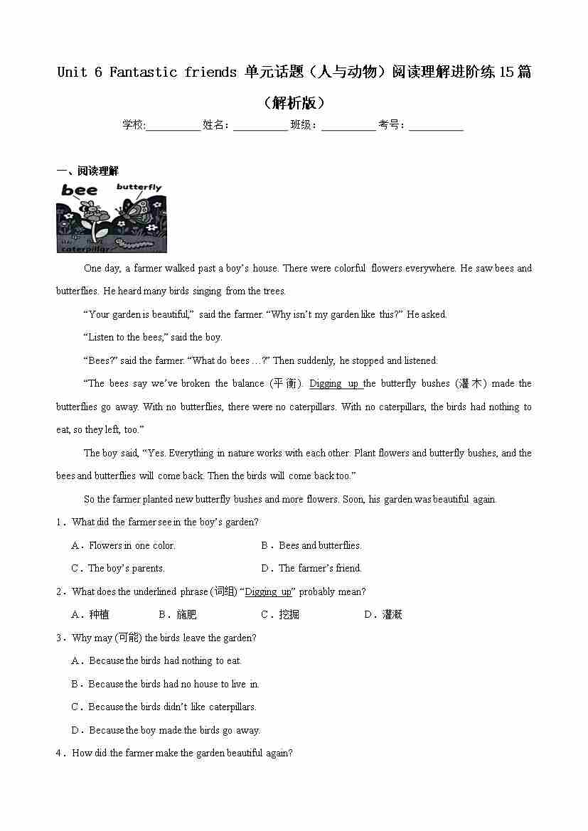 Unit 6 Fantastic friends 单元话题(人与动物)阅读回答问题进阶练15篇(原卷版)