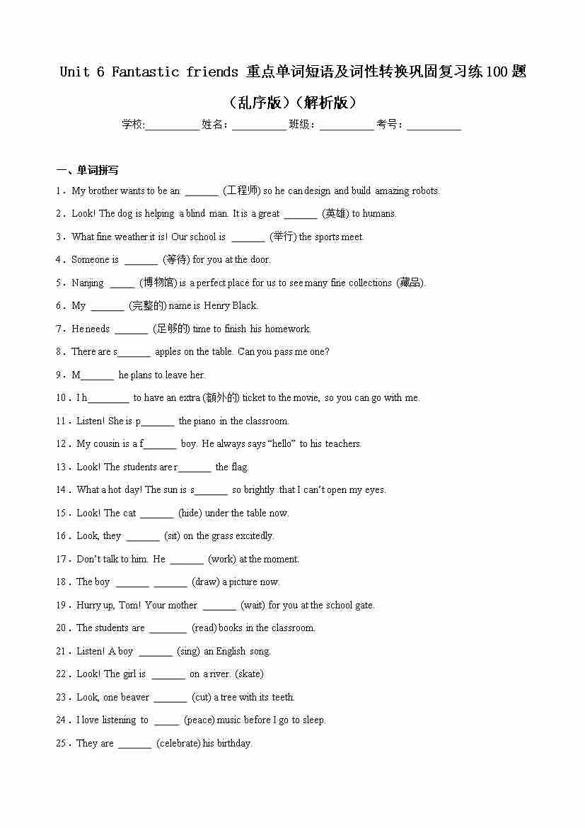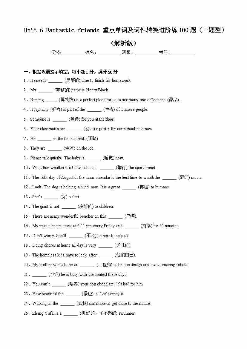 Unit 6 Fantastic friends 重点单词及词性转换进阶练100题(三题型)(原卷版)