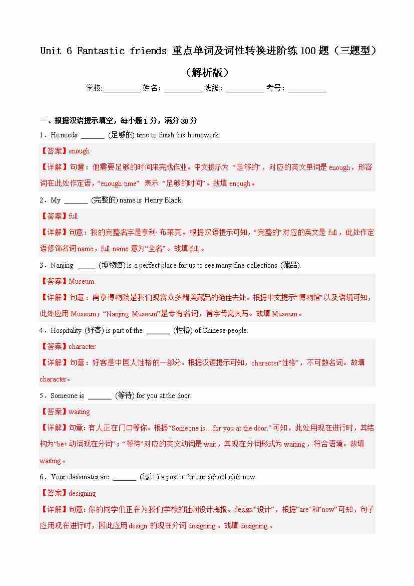 Unit 6 Fantastic friends 重点单词及词性转换进阶练100题(三题型)(解析版)