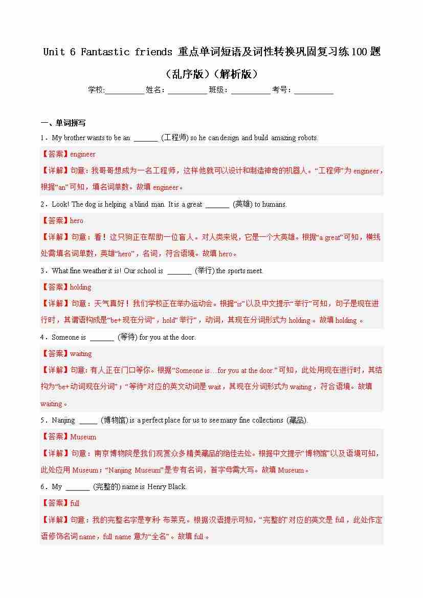 Unit 6 Fantastic friends 重点单词短语及词性转换巩固复习练100题(乱序版)(解析版)