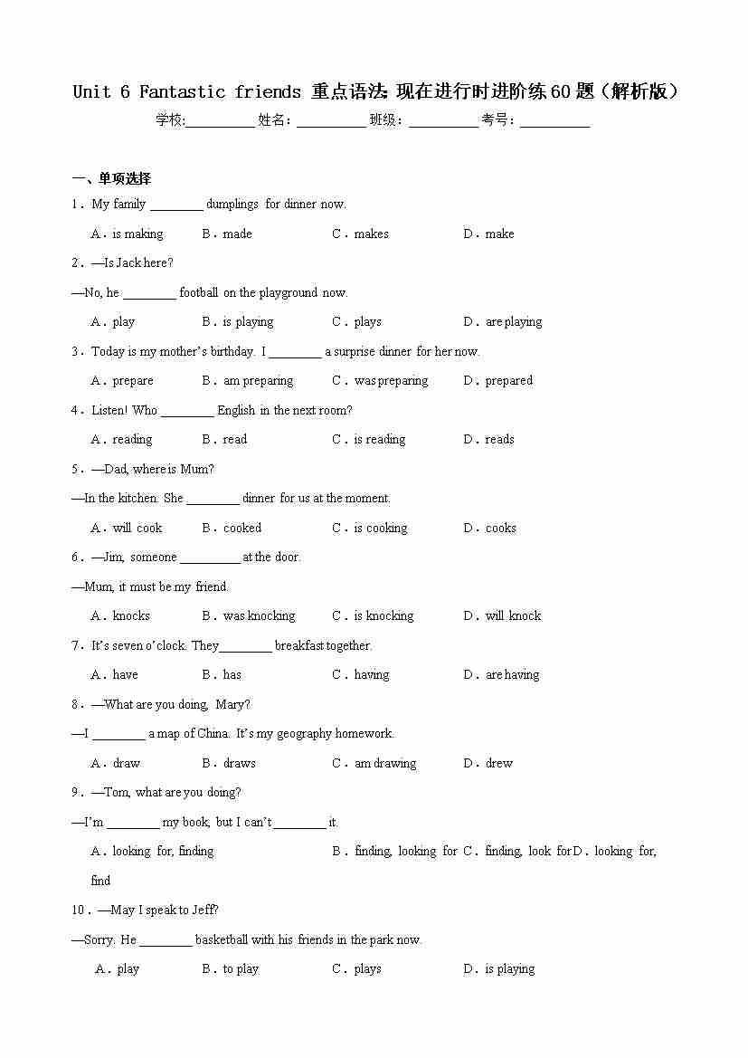 Unit 6 Fantastic friends 重点语法:现在进行时进阶练60题(原卷版)