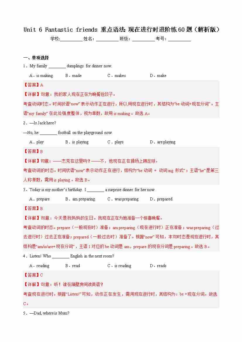 Unit 6 Fantastic friends 重点语法:现在进行时进阶练60题(解析版)