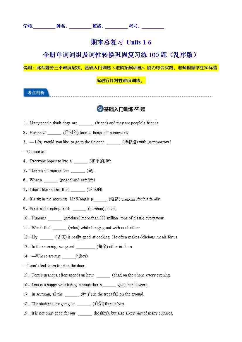 期末总复习 Units 1-6 全册单词词组及词性转换巩固复习练100题(乱序版)(原卷版)