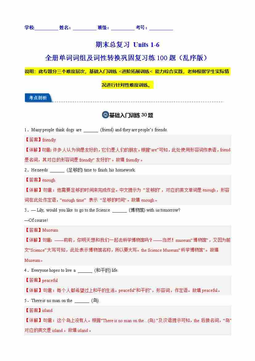 期末总复习 Units 1-6 全册单词词组及词性转换巩固复习练100题(乱序版)(解析版)