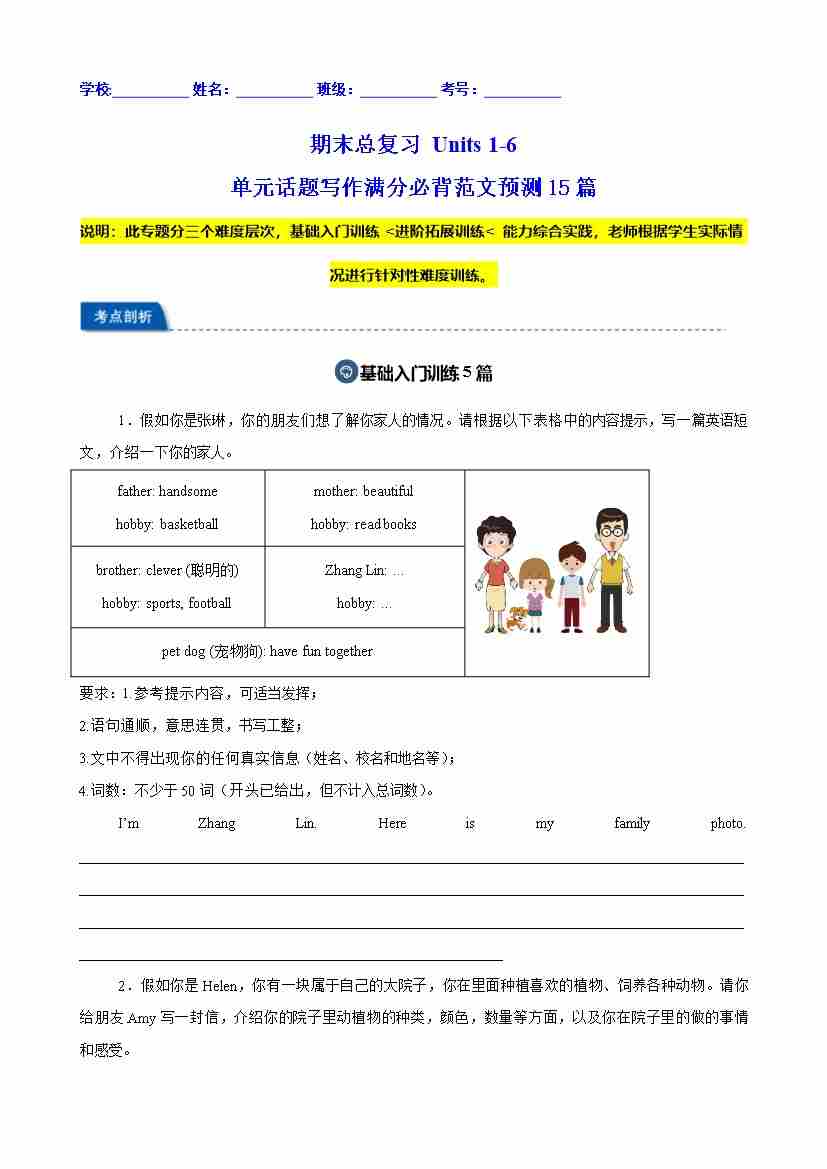 期末总复习 Units 1-6 单元话题写作满分必背范文预测15篇(原卷版)