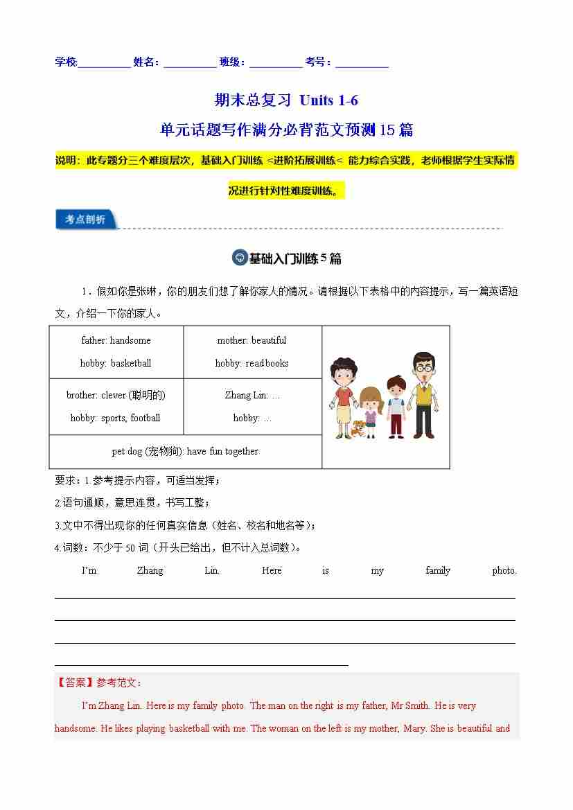 期末总复习 Units 1-6 单元话题写作满分必背范文预测15篇(解析版)