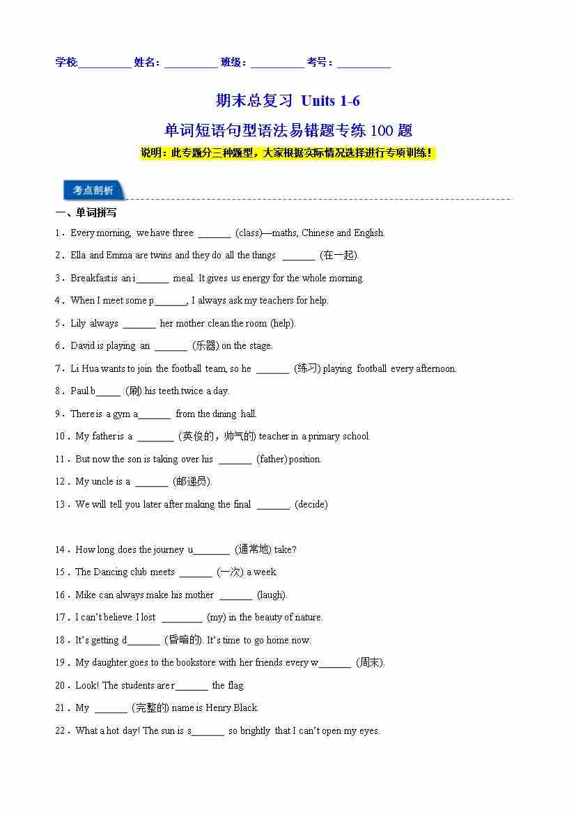 期末总复习 Units 1-6 单词短语句型语法易错题专练100题(原卷版)