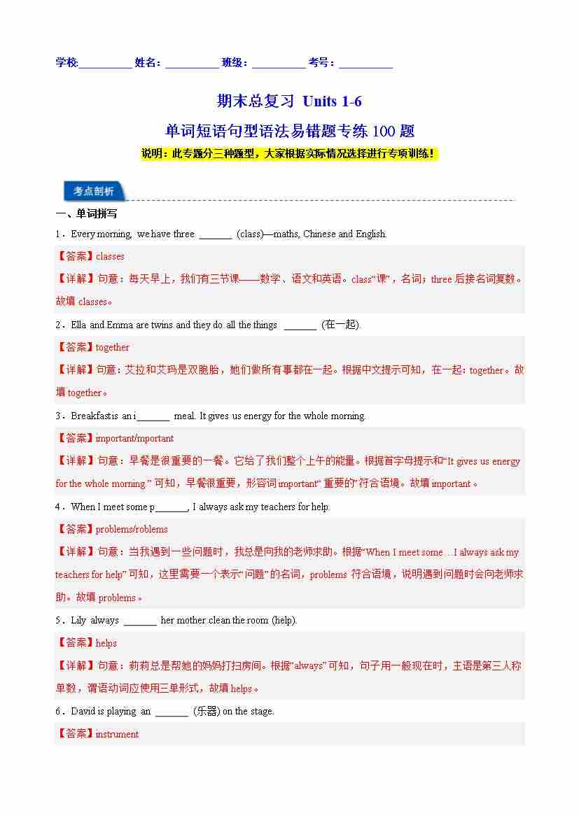期末总复习 Units 1-6 单词短语句型语法易错题专练100题(解析版)