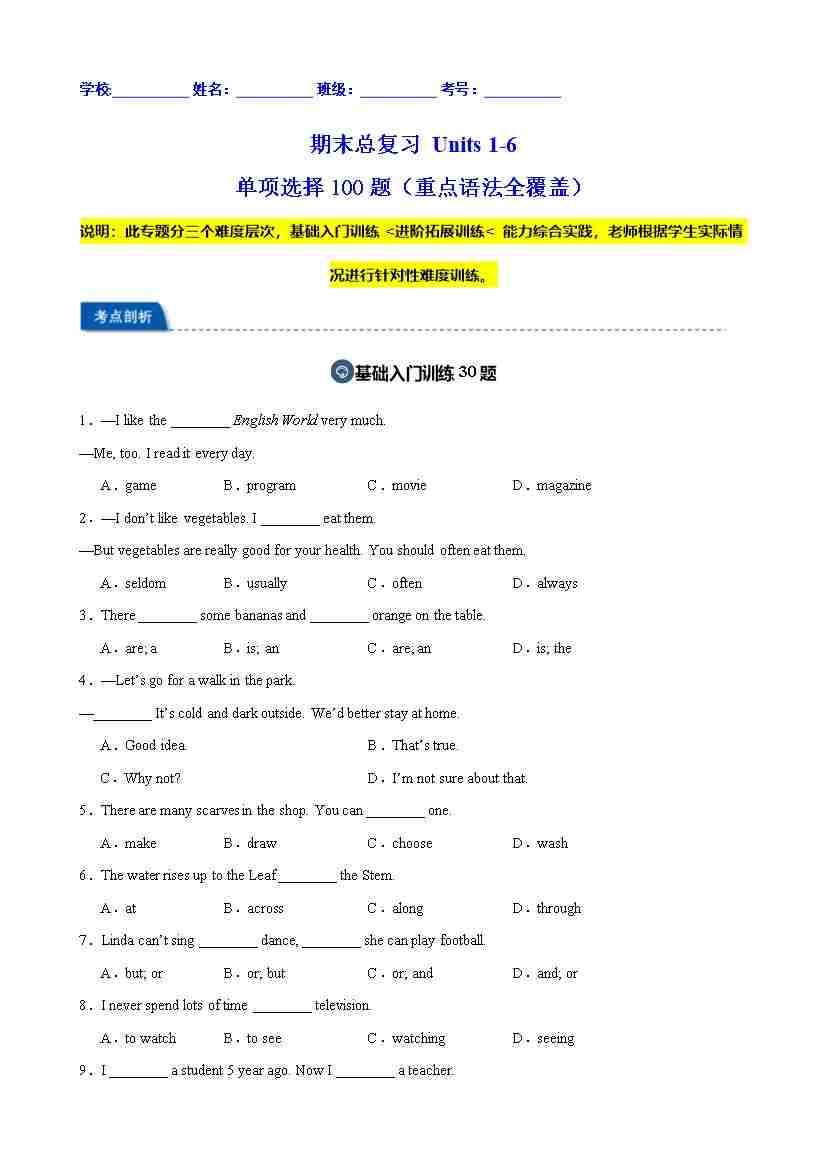 期末总复习 Units 1-6 单项选择100题(重点语法全覆盖)(原卷版)
