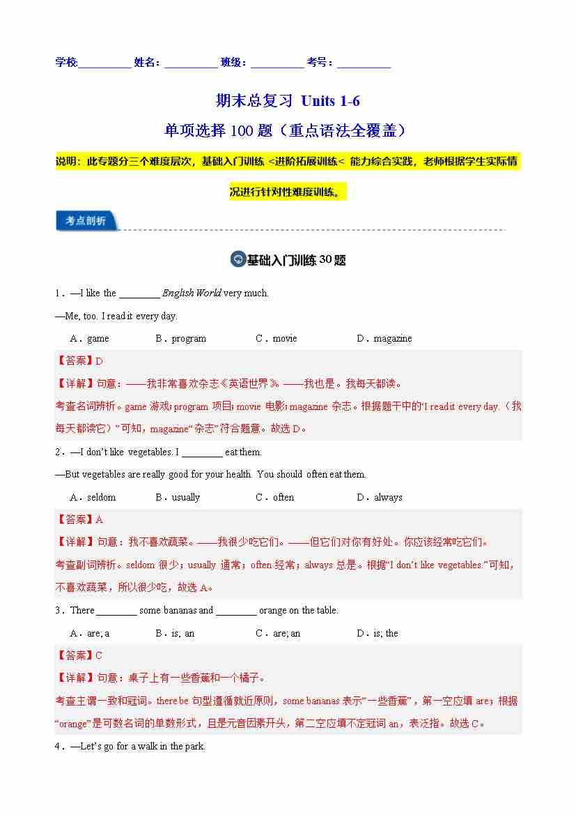 期末总复习 Units 1-6 单项选择100题(重点语法全覆盖)(解析版)