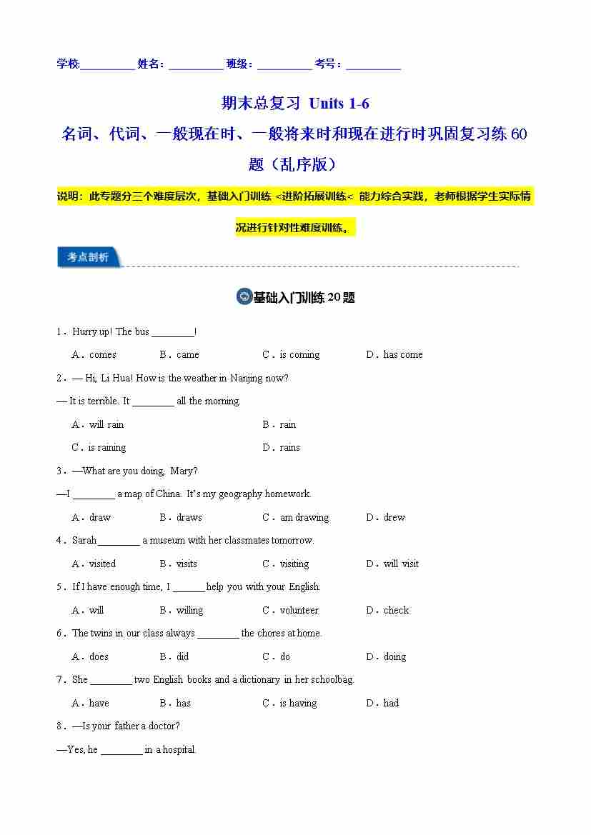 期末总复习 Units 1-6 名词、代词、一般现在时、一般将来时和现在进行时巩固复习练60题(乱序版)(原卷版)