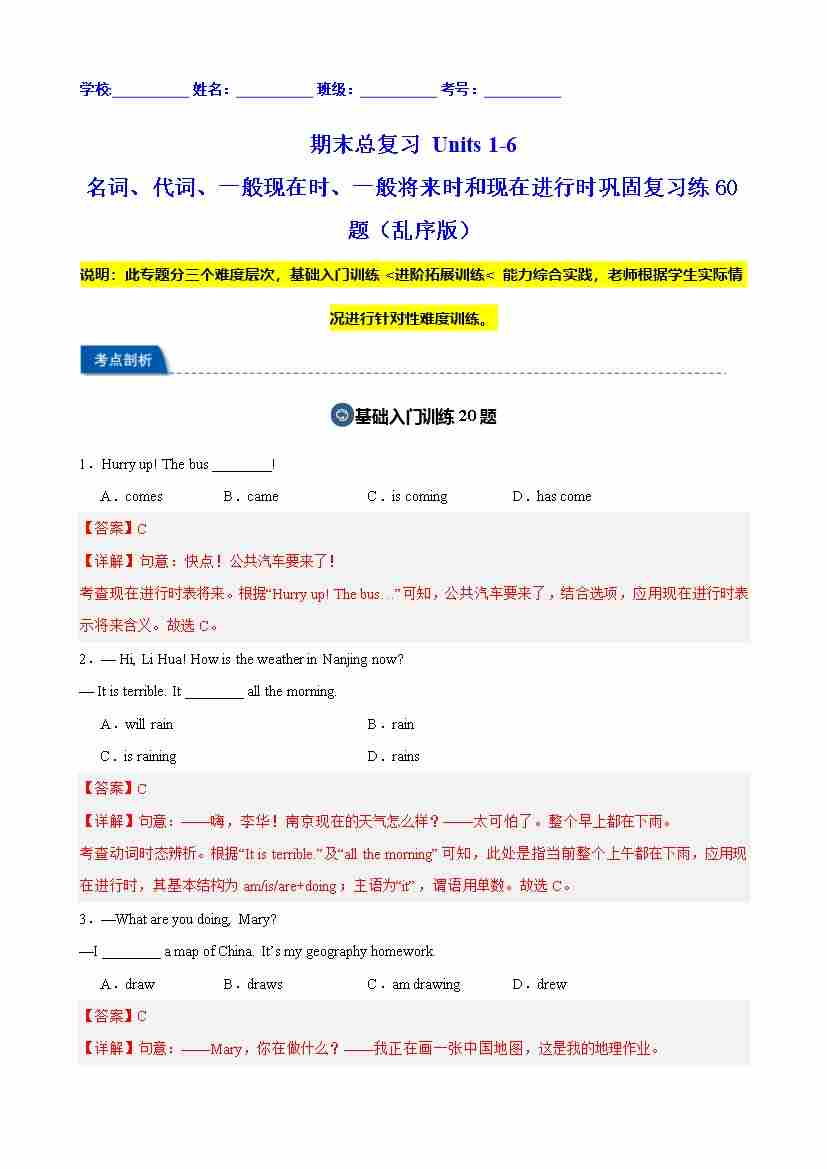 期末总复习 Units 1-6 名词、代词、一般现在时、一般将来时和现在进行时巩固复习练60题(乱序版)(解析版)