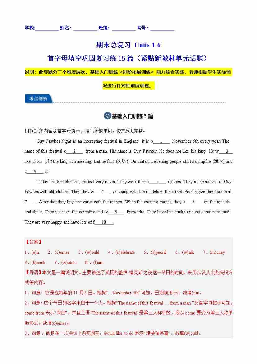 期末总复习 Units 1-6 首字母填空巩固复习练15篇(紧贴新教材单元话题)(解析版)