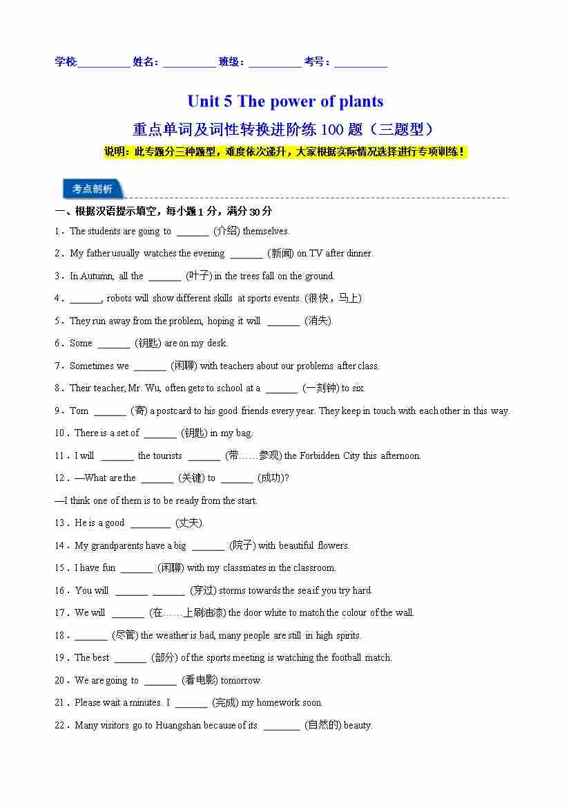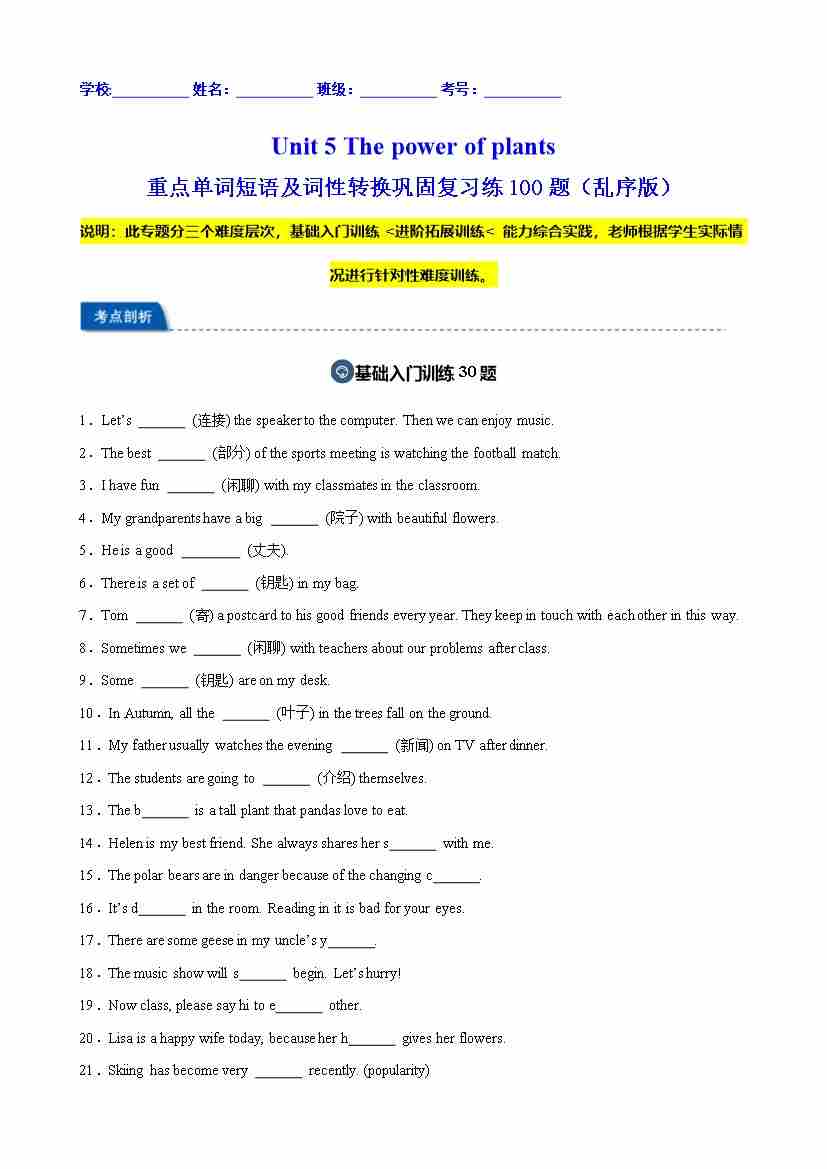 Unit 5 The power of plants 重点单词及词性转换进阶练100题(三题型)(原卷版)