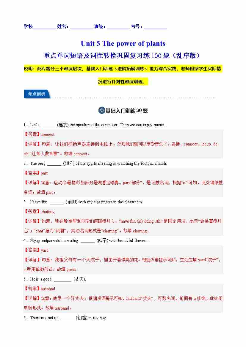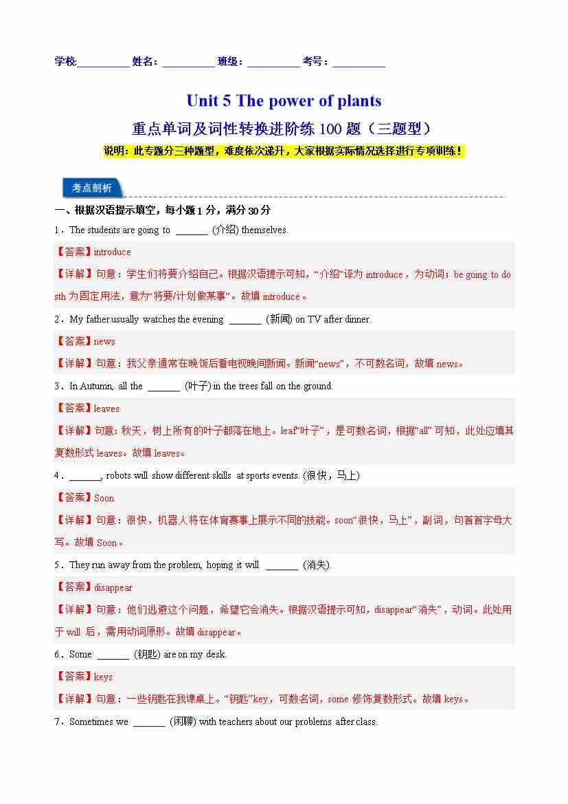 Unit 5 The power of plants 重点单词及词性转换进阶练100题(三题型)(解析版)