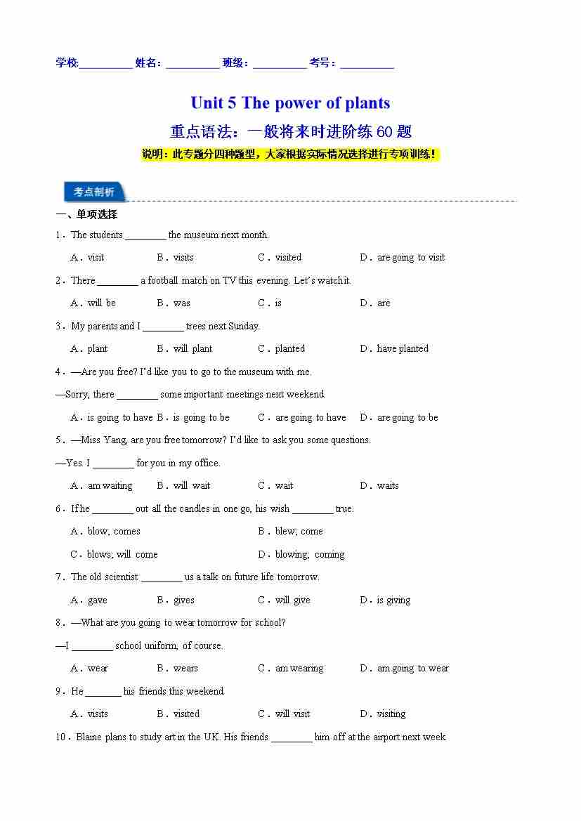 Unit 5 The power of plants 重点语法:一般将来时进阶练60题(原卷版)