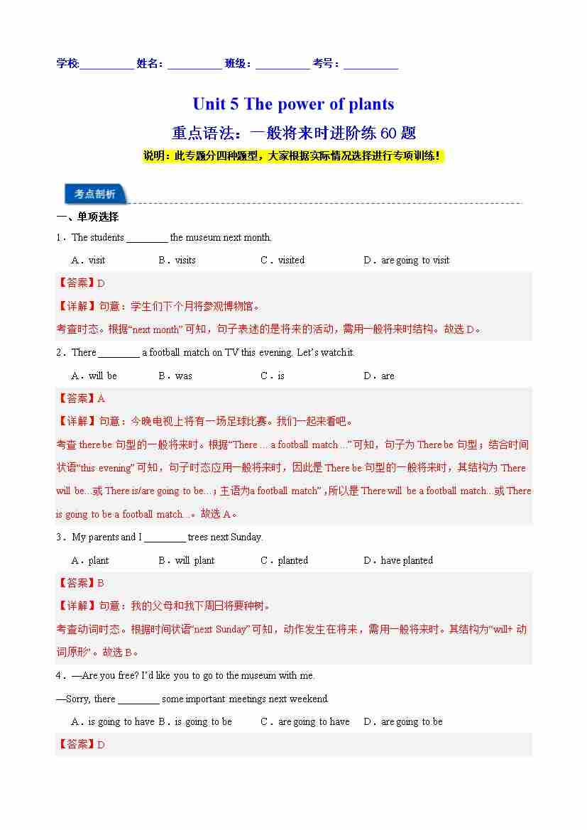 Unit 5 The power of plants 重点语法:一般将来时进阶练60题(解析版)