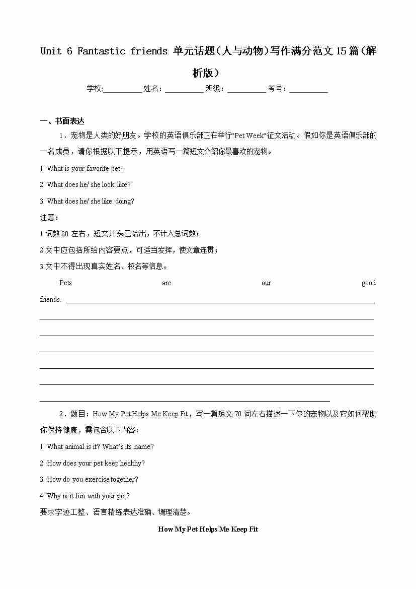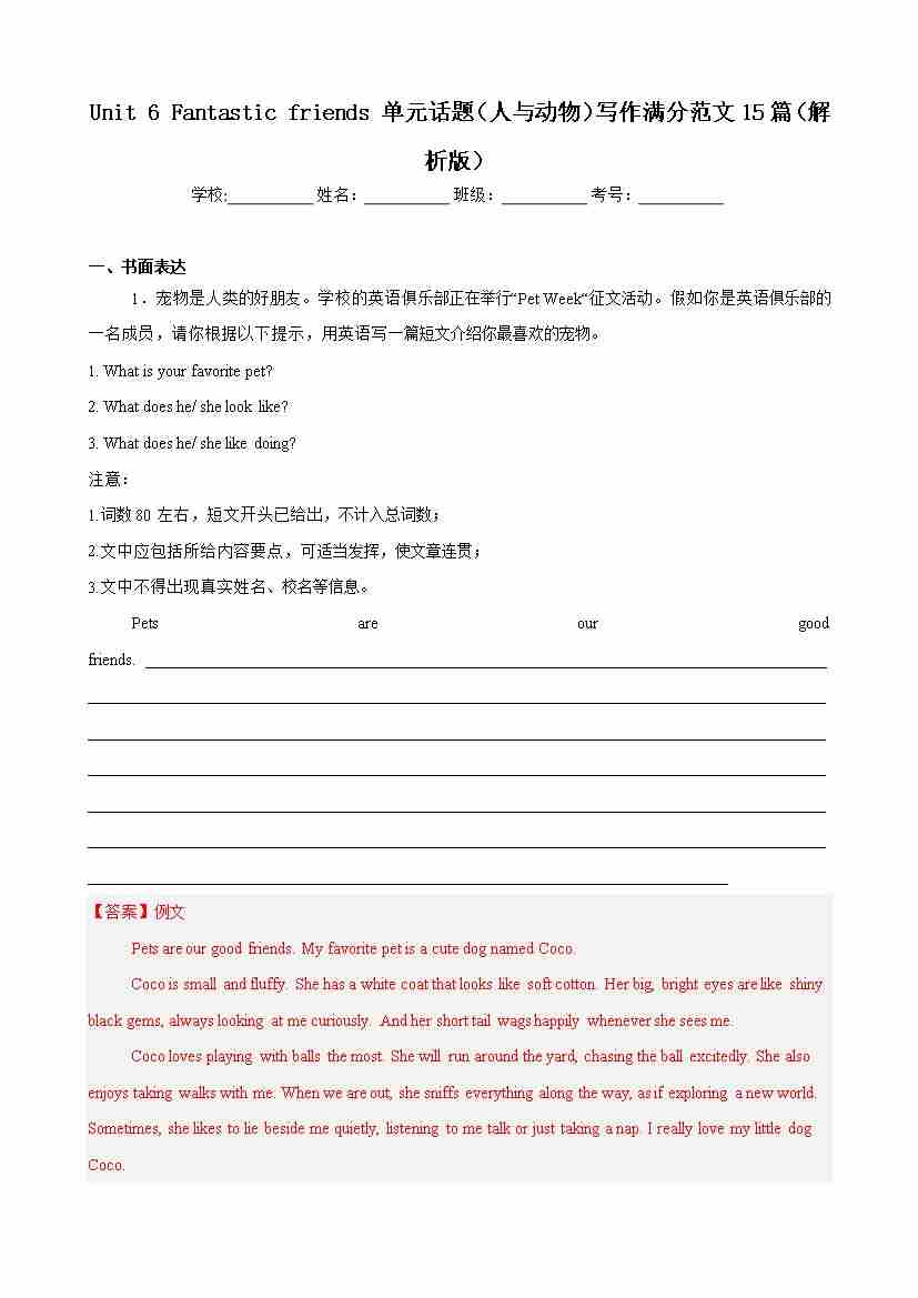 Unit 6 Fantastic friends 单元话题(人与动物)写作满分范文15篇(原卷版)