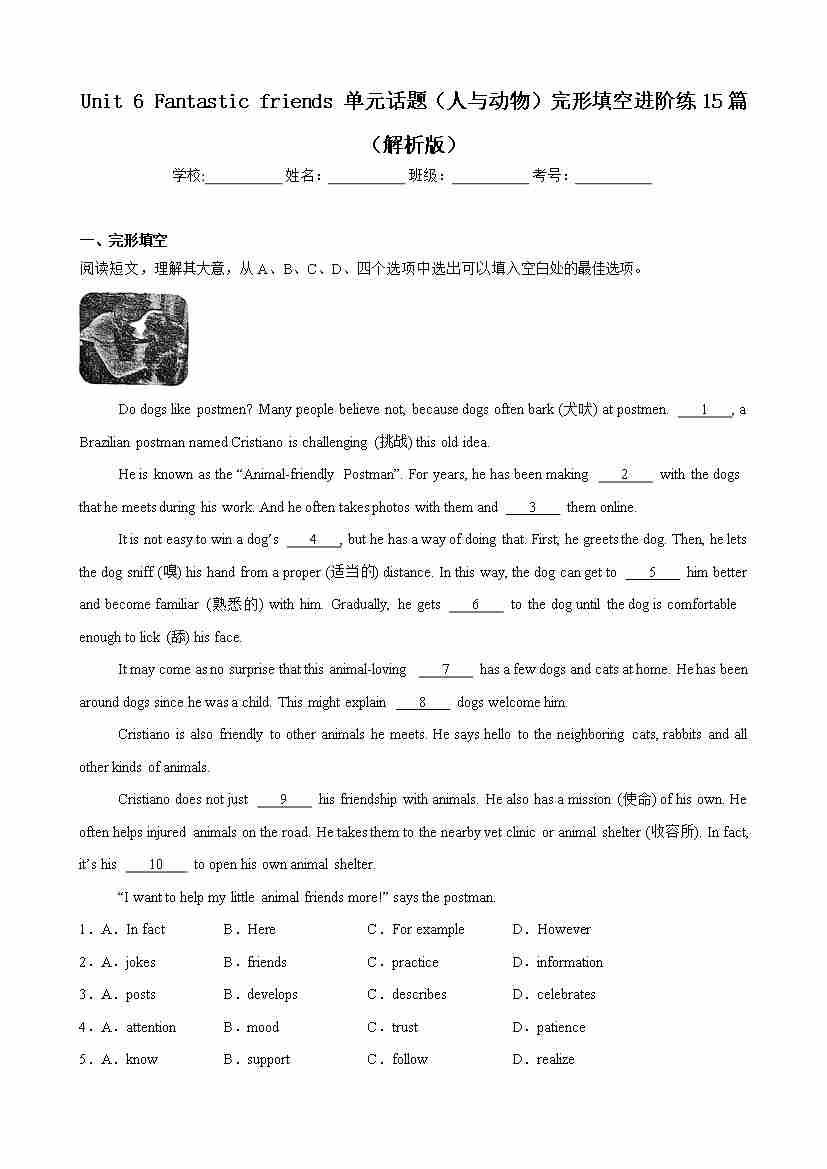 Unit 6 Fantastic friends 单元话题(人与动物)完形填空进阶练15篇(解析版)