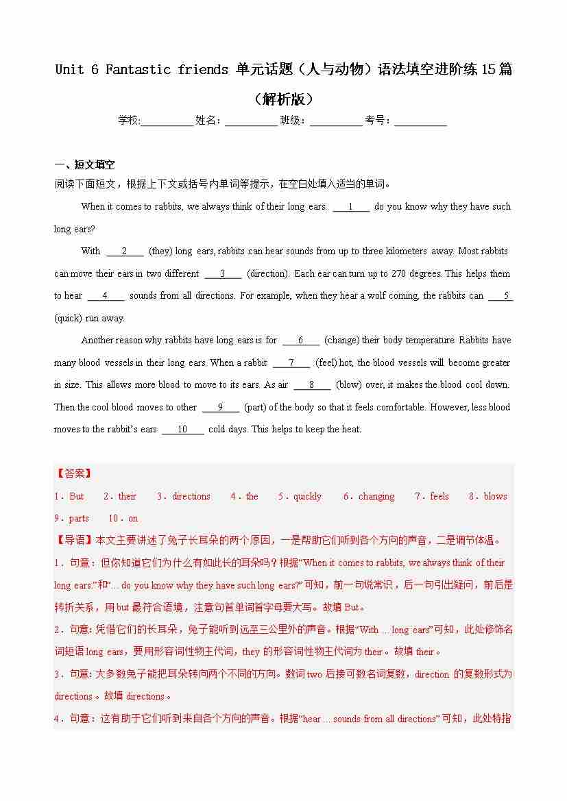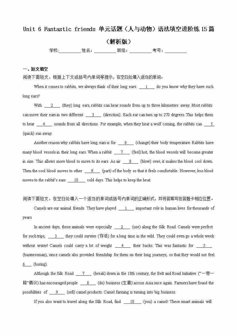 Unit 6 Fantastic friends 单元话题(人与动物)语法填空进阶练15篇(解析版)