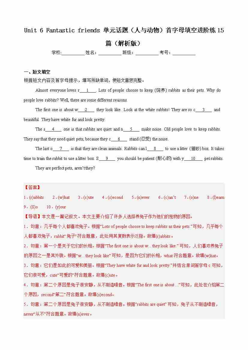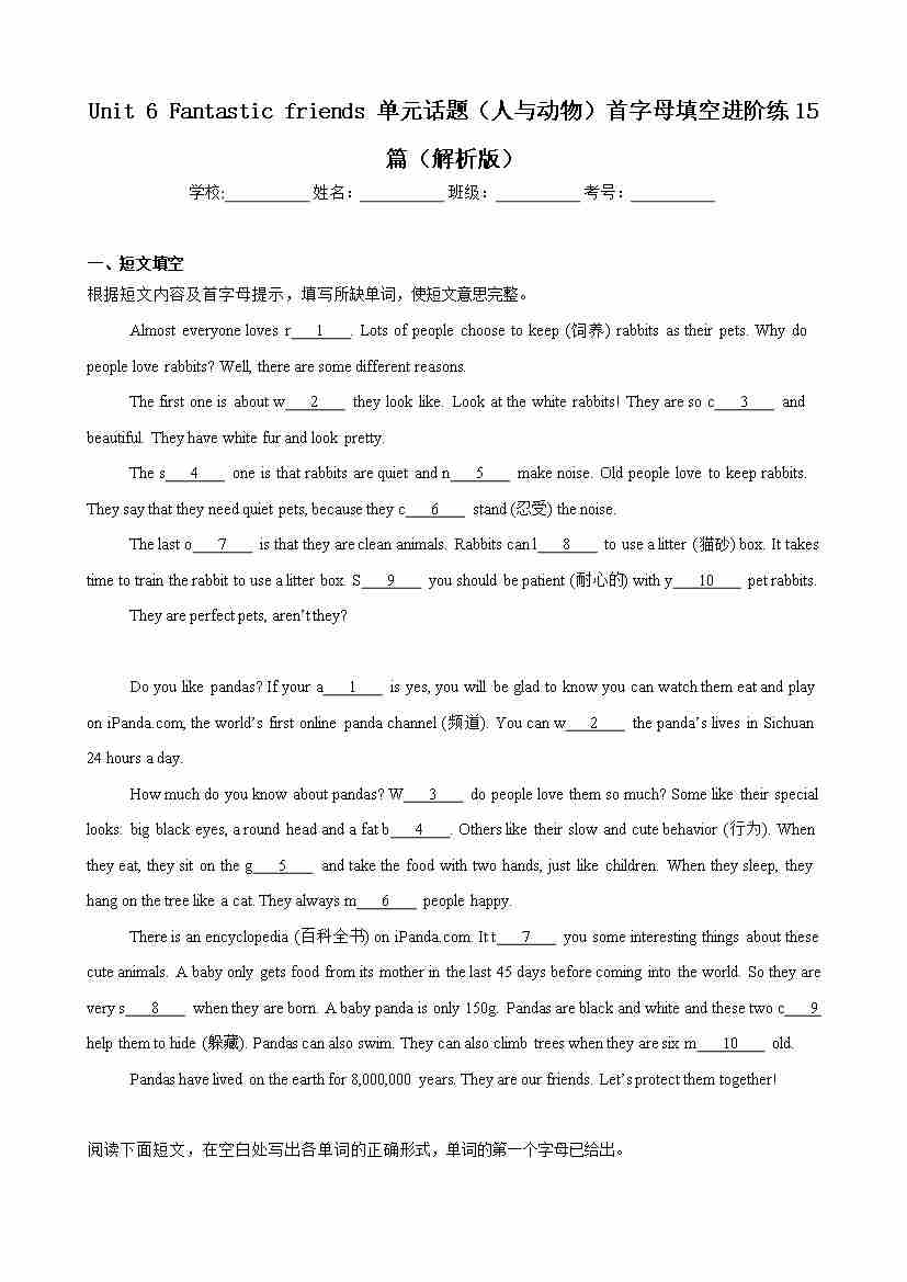 Unit 6 Fantastic friends 单元话题(人与动物)首字母填空进阶练15篇(解析版)
