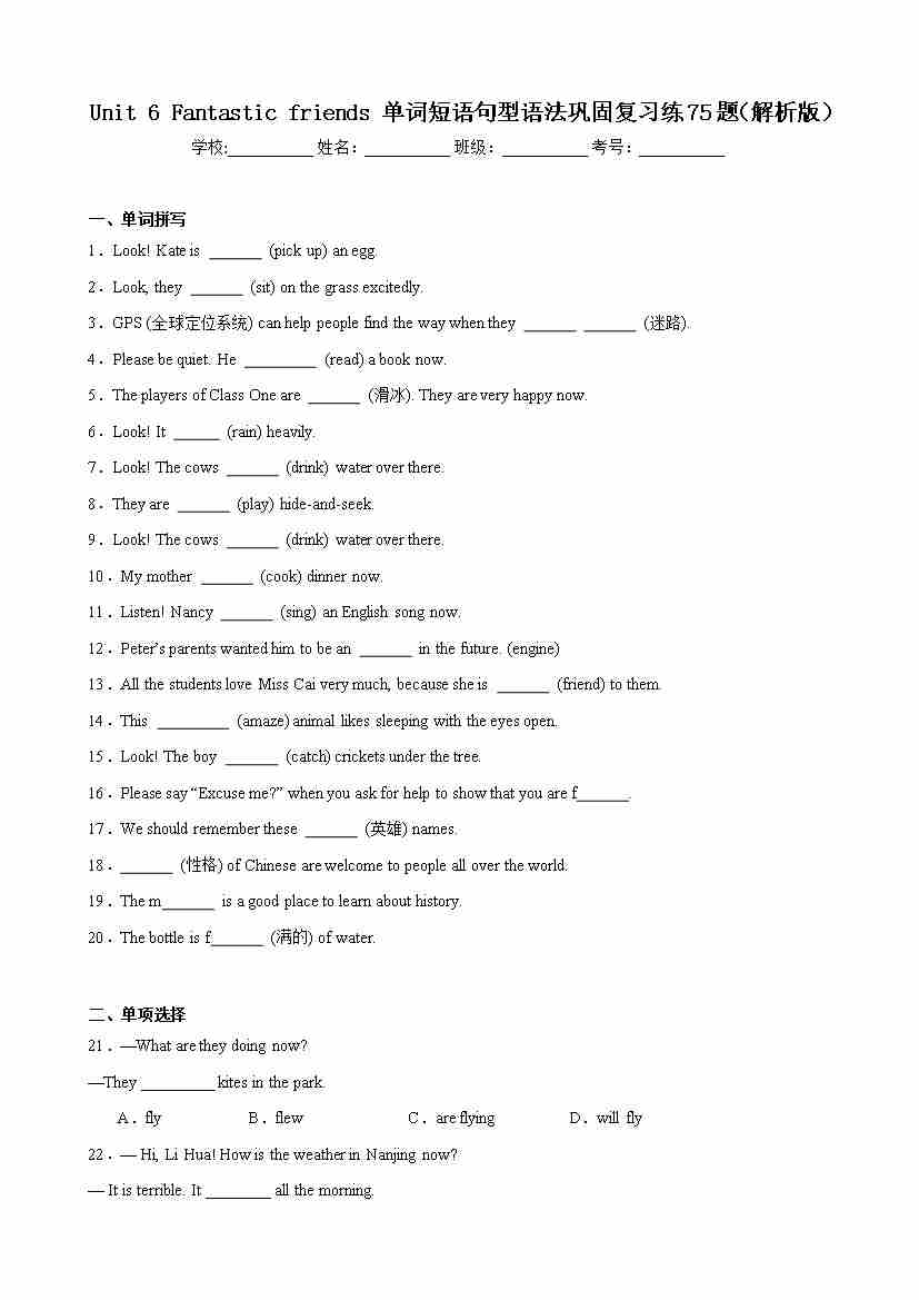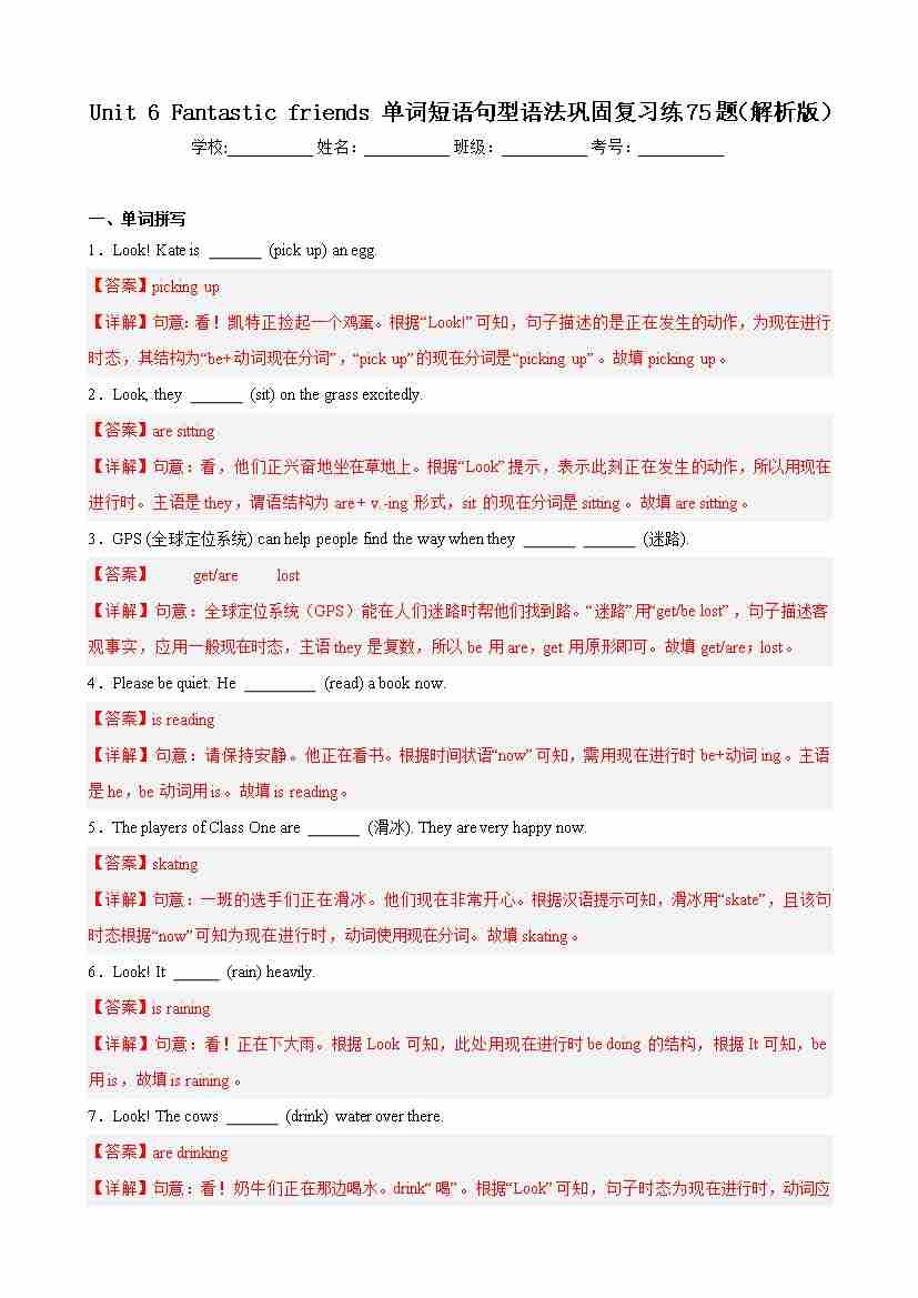 Unit 6 Fantastic friends 单词短语句型语法巩固复习练75题(解析版)