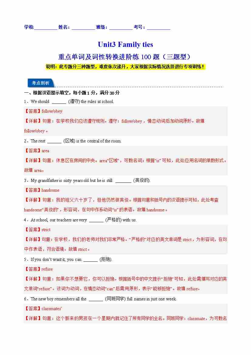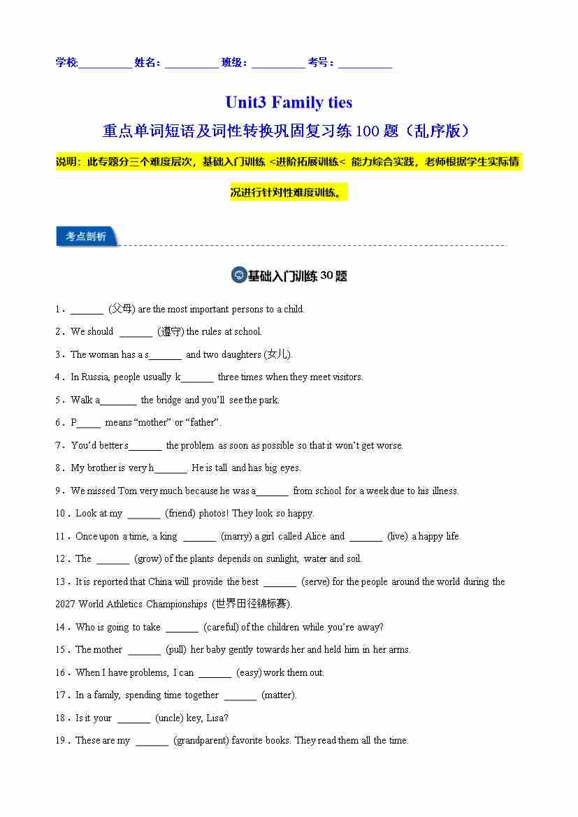 Unit3 Family ties 重点单词及词性转换进阶练100题(三题型)(教师版)