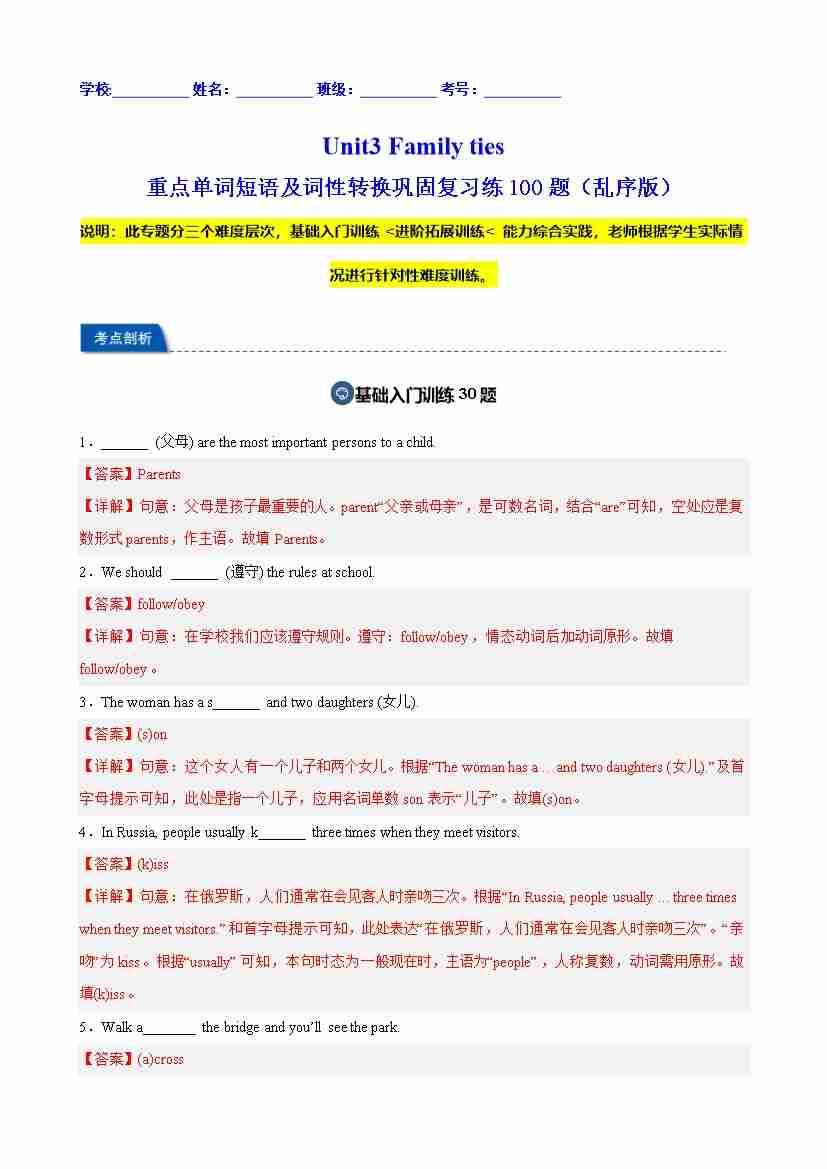 Unit3 Family ties 重点单词短语及词性转换巩固复习练100题(乱序版)(教师版)
